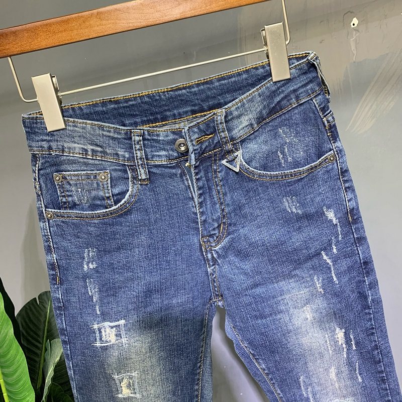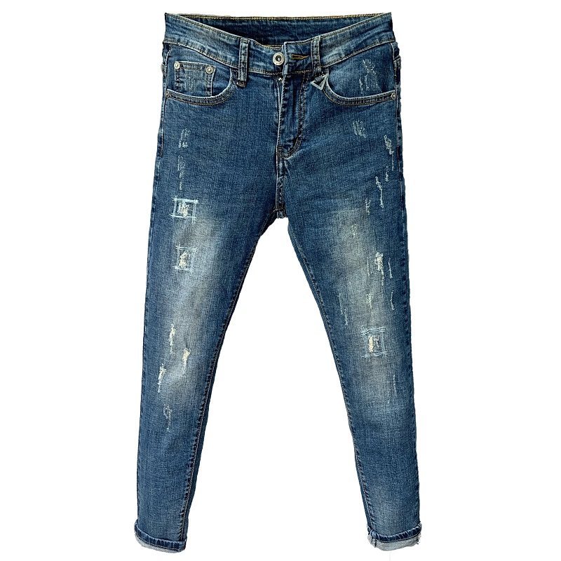潮男牛仔裤破洞韩版潮流修身小脚蓝色弹力休闲男士秋冬时尚九分裤
