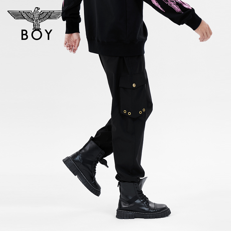 BOYLONDON秋季男女同款长裤烫金印花黑色潮牌设计感哈伦裤N34003