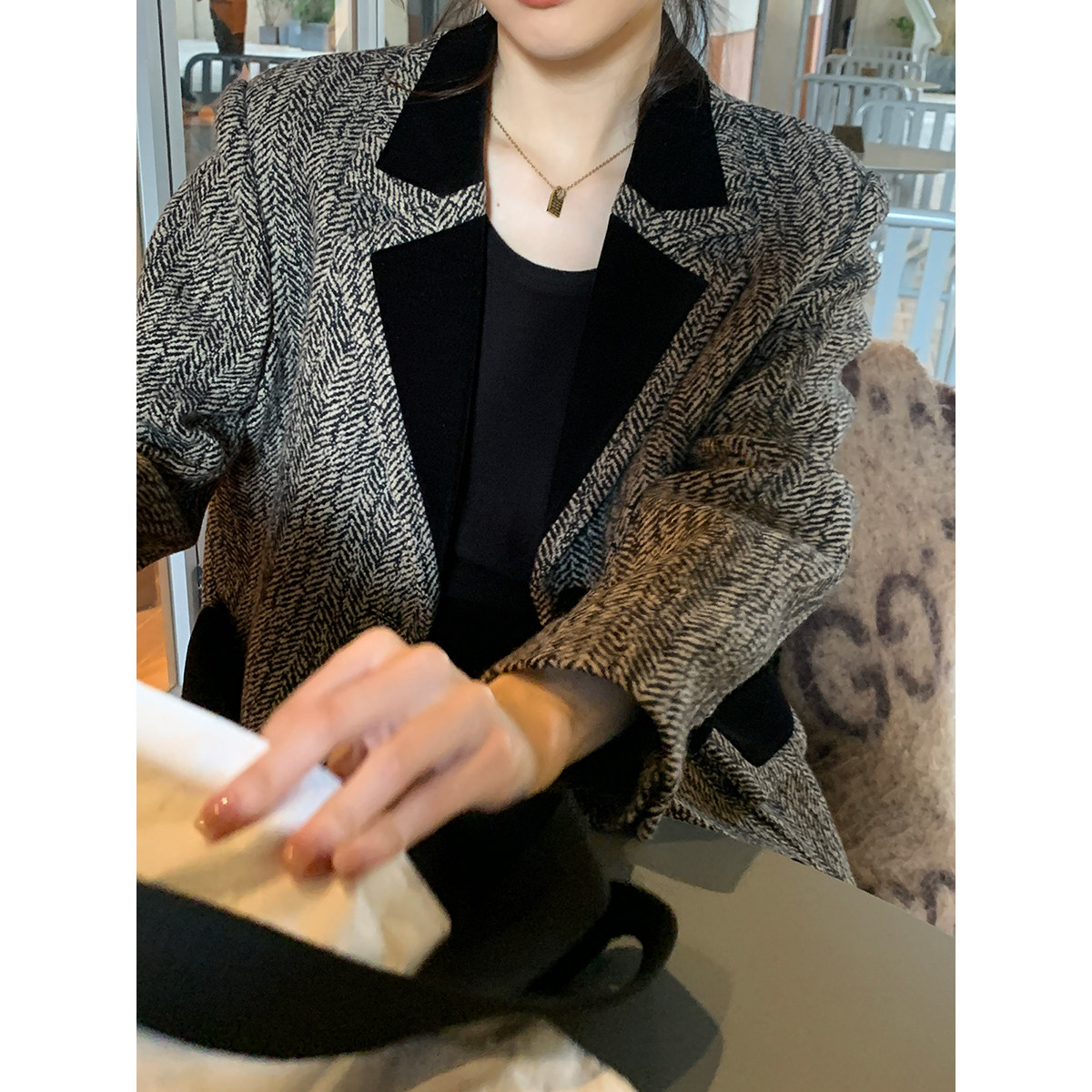 伦敦冬令时 很妙的不规则人字纹 丝绒领拼接羊毛夹棉西装短裙套装