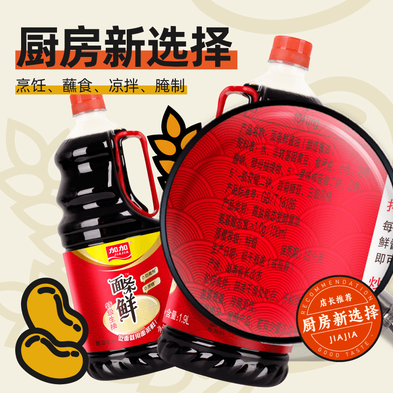 加加面条鲜1.9L特级生抽180天黄豆酿造酱油0添加防腐剂家用调味品