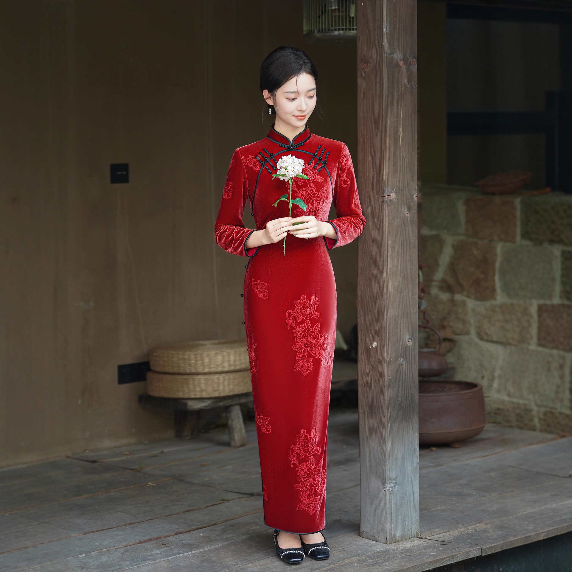 中式丝绒绣花旗袍女敬酒服