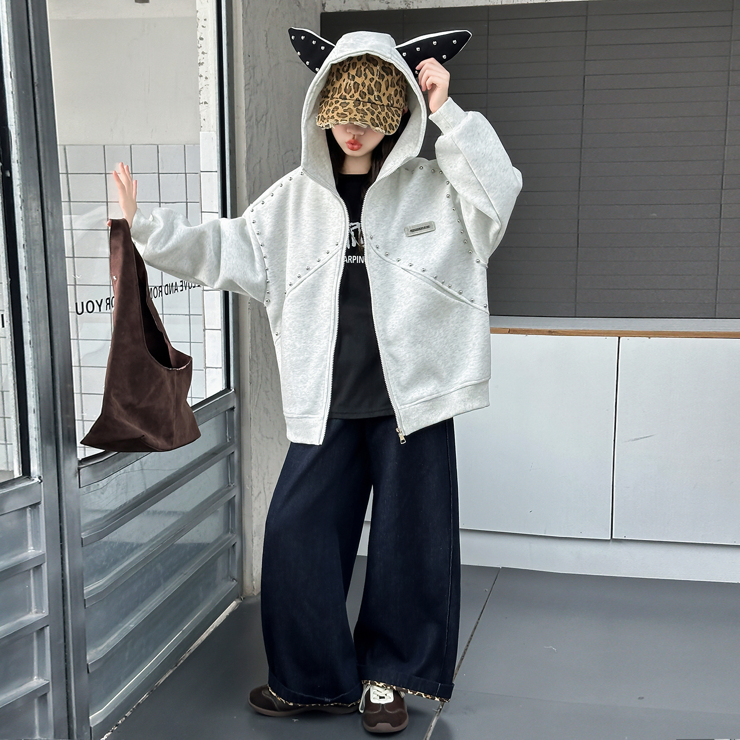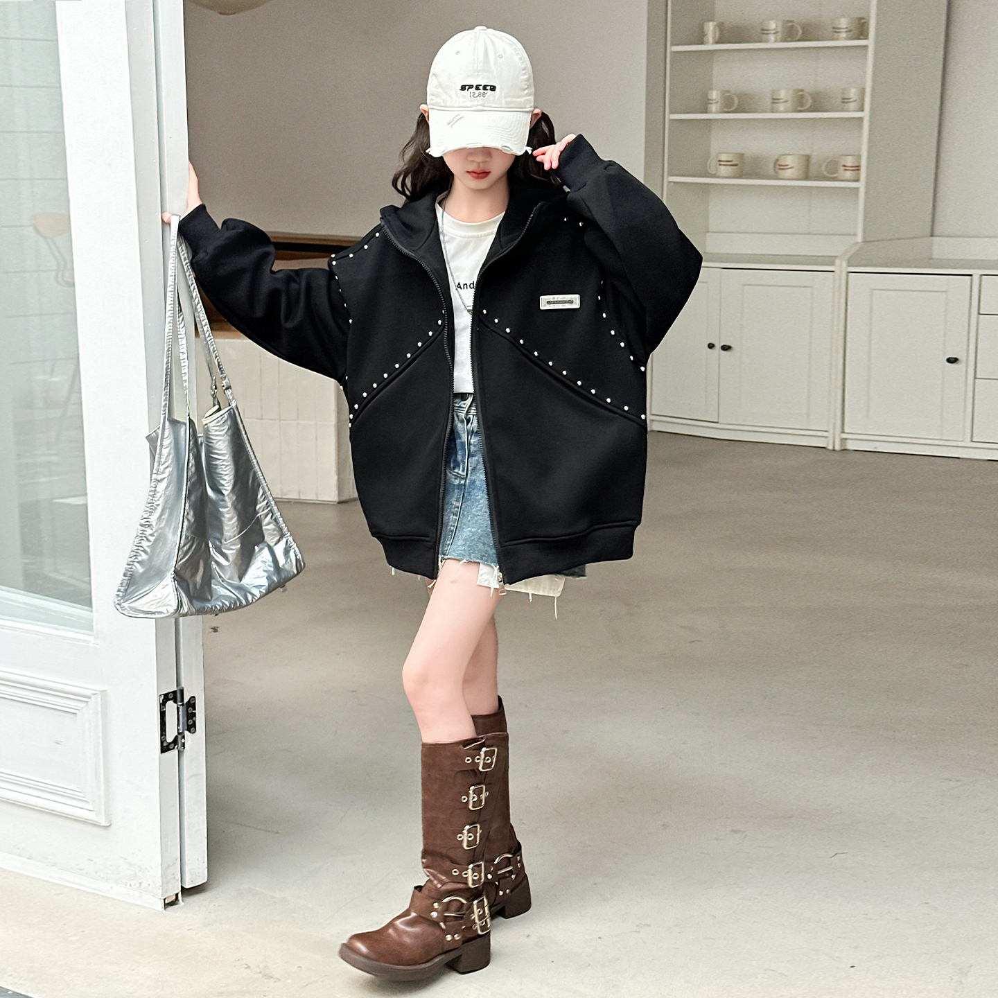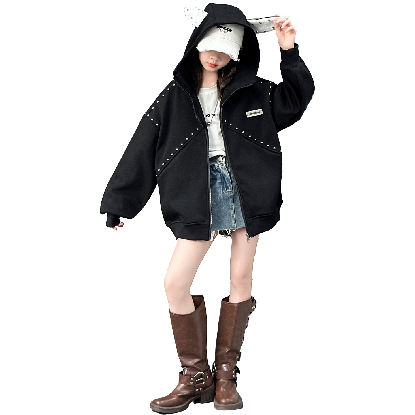 女童秋装美式休闲外套2025新款洋气春秋拼接卫衣连帽女孩宽松夹克