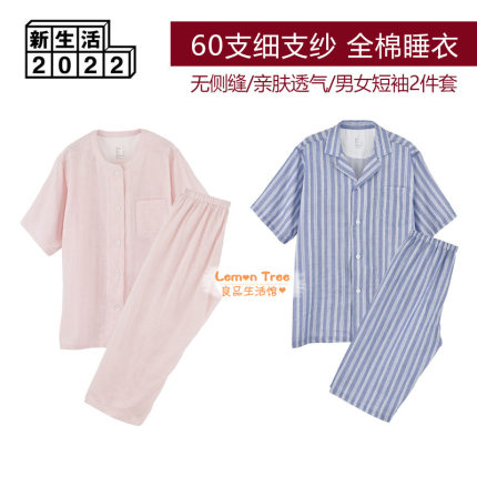 日式纯棉双层纱睡衣短袖五分女款春秋薄款全棉男士家居服长裤套装