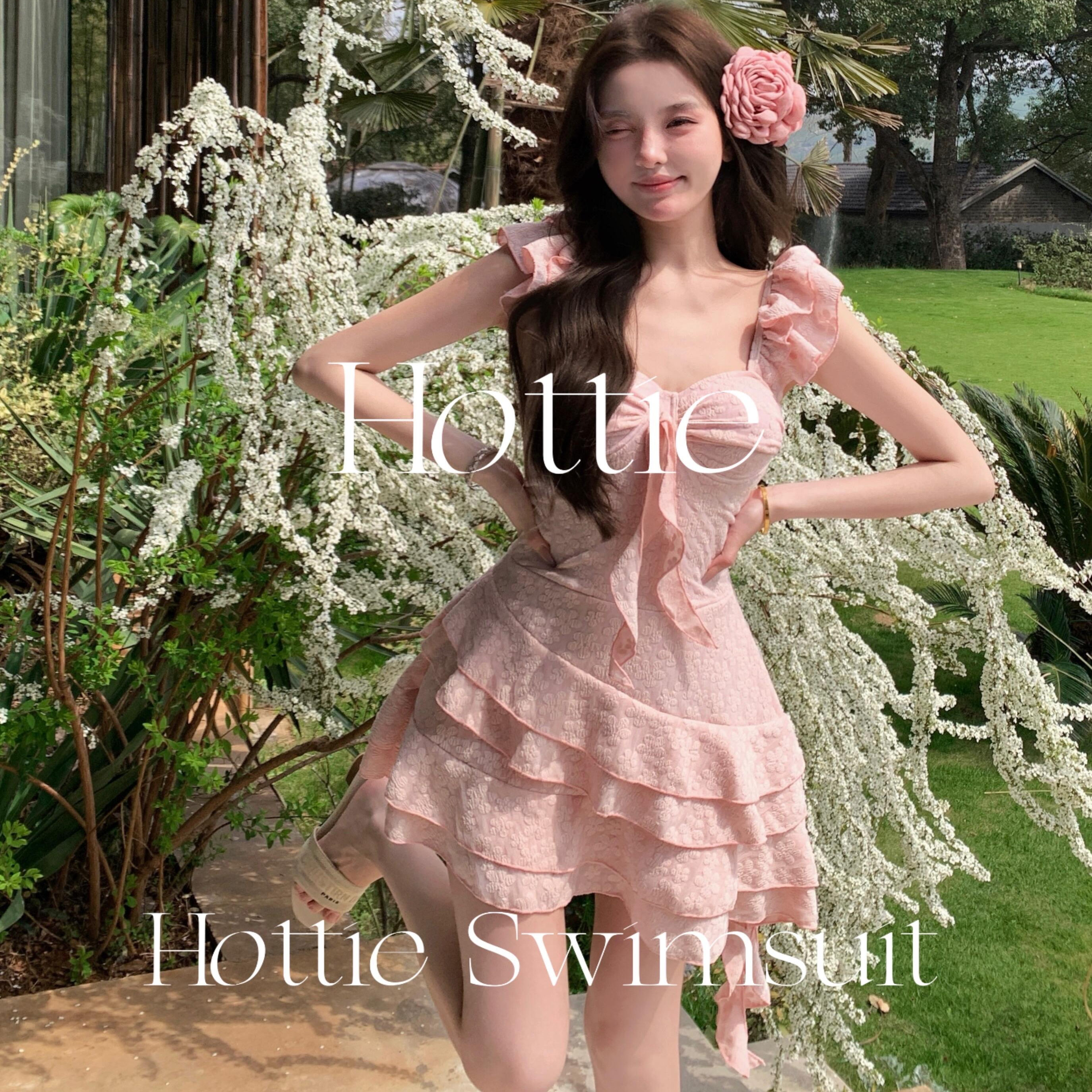 甜美粉色少女风纯欲裙式连体泳衣显瘦遮肉遮肚沙滩温泉度假泳衣女