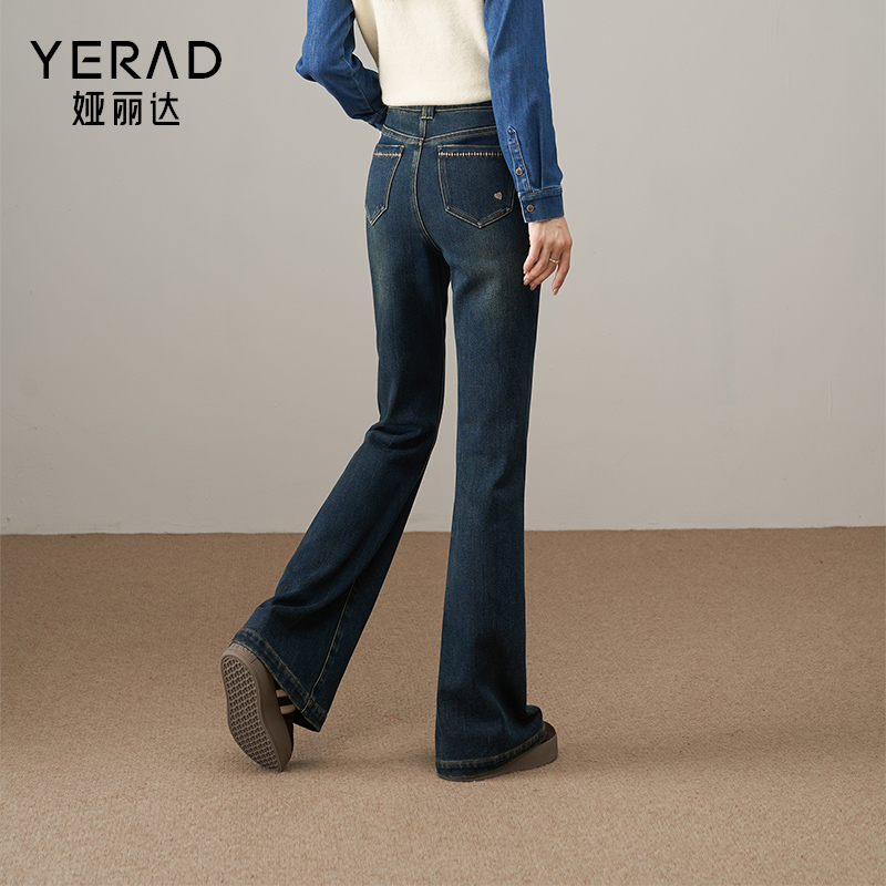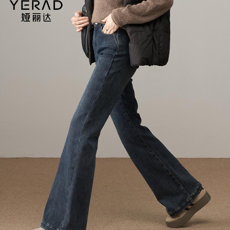 娅丽达加绒喇叭裤修身微喇牛仔裤女2025年冬季新款马蹄裤拖地长裤