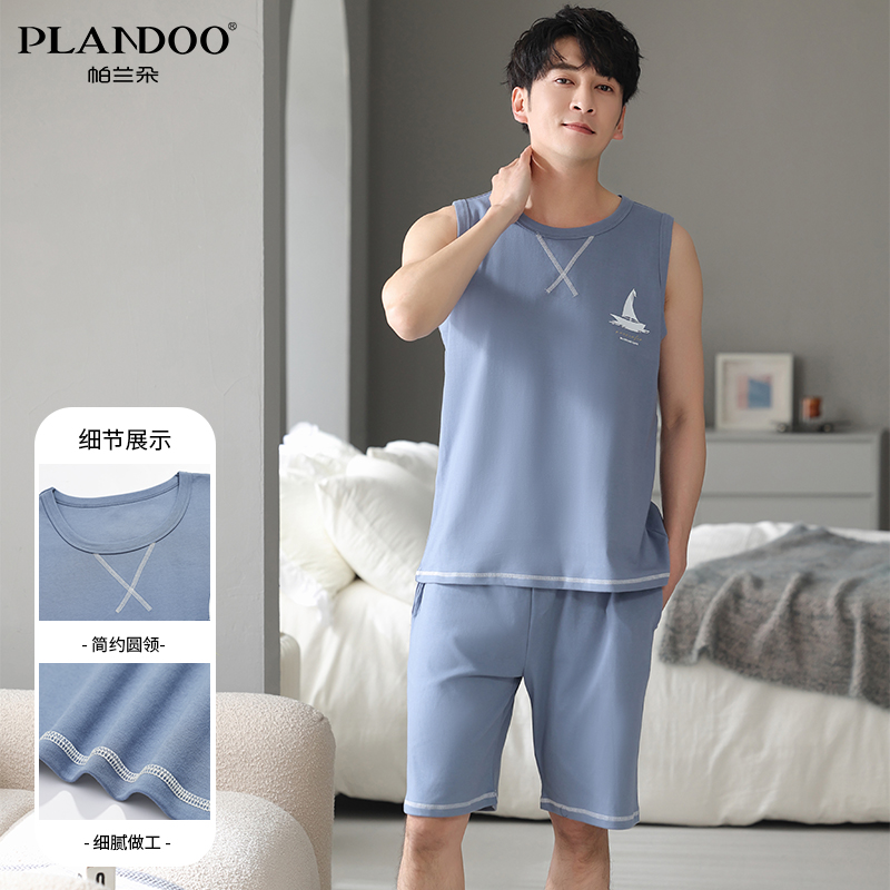 帕兰朵纯棉睡衣男士无袖背心短裤宽松夏季新款休闲大码家居服套装
