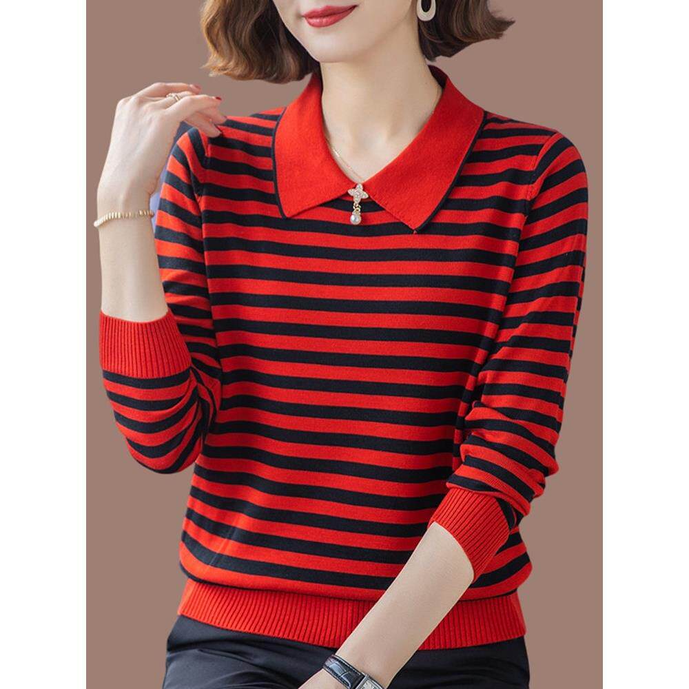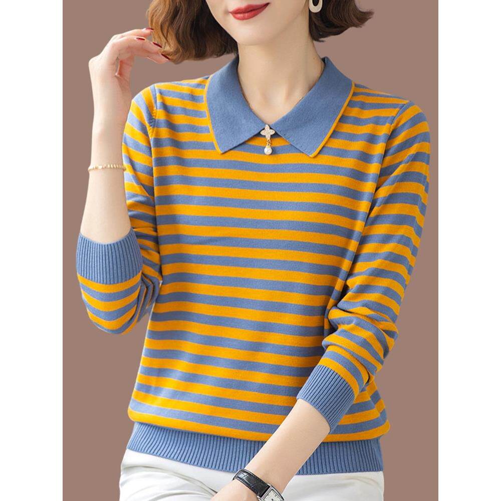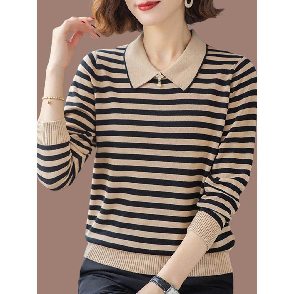 鄂尔多斯市新款桑蚕丝条纹长袖t恤女秋装翻领妈妈针织上衣打底衫
