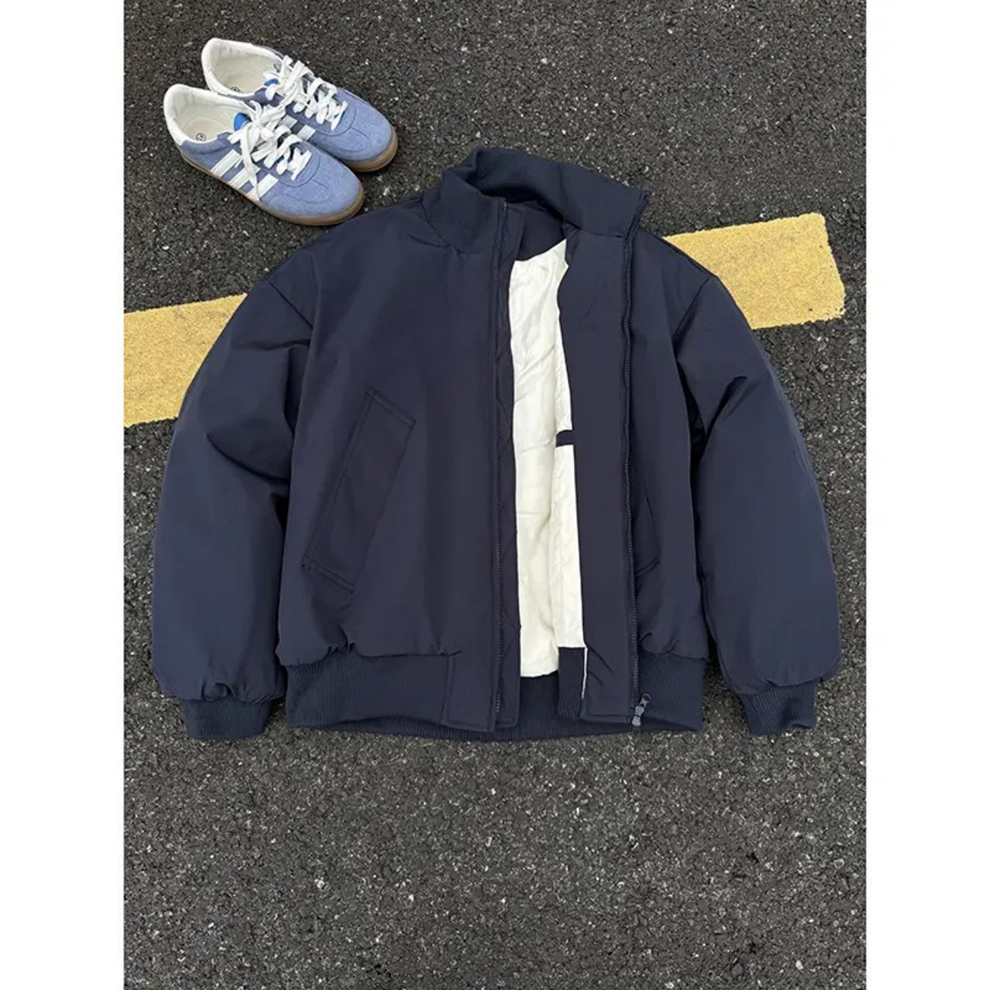 藏青色棒球领羽绒服男冬季美式廓形晋江棉衣短款立领飞行夹克棉服