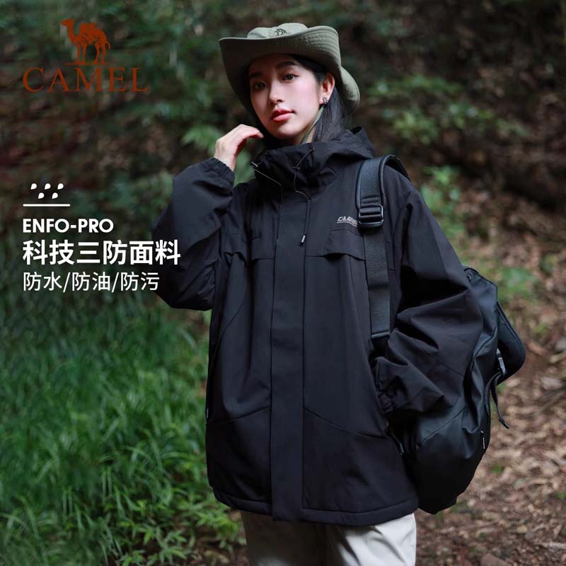 骆驼运动登山服外套女士秋冬加绒连帽夹克户外防风防水休闲茄克男