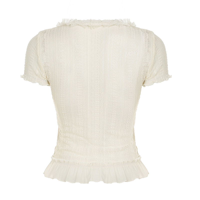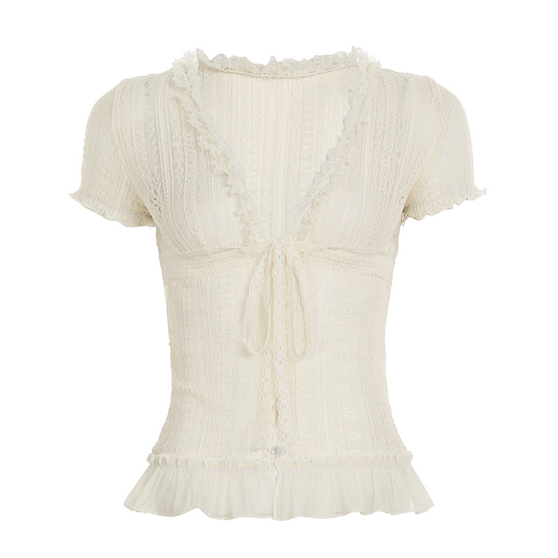 AOMR法式纯欲微透绑带蕾丝雪纺上衣女夏季轻薄木耳V领排扣开衫T恤