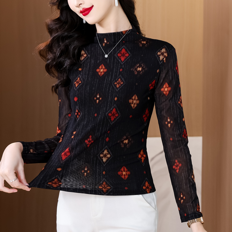 2025秋季新款半高领印花网纱打底衫女显瘦百搭长袖T恤高级感上衣