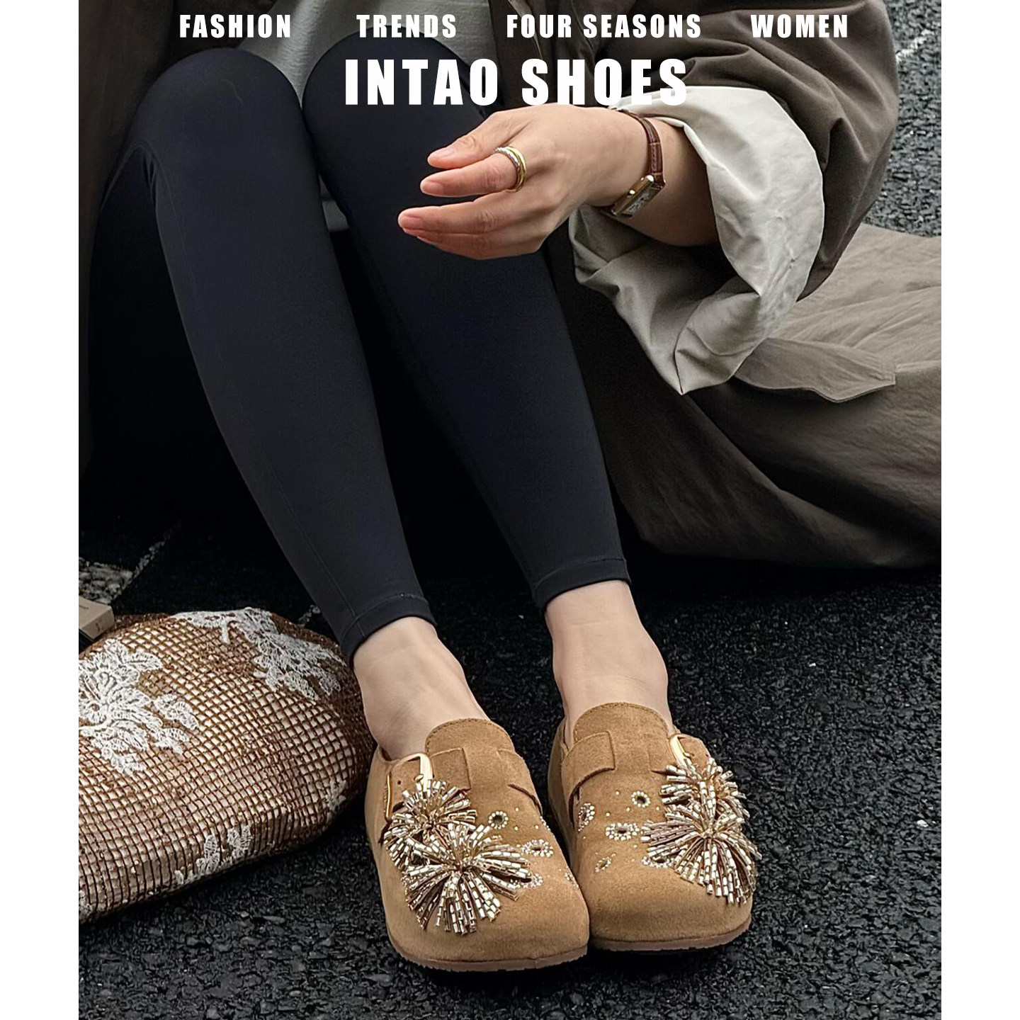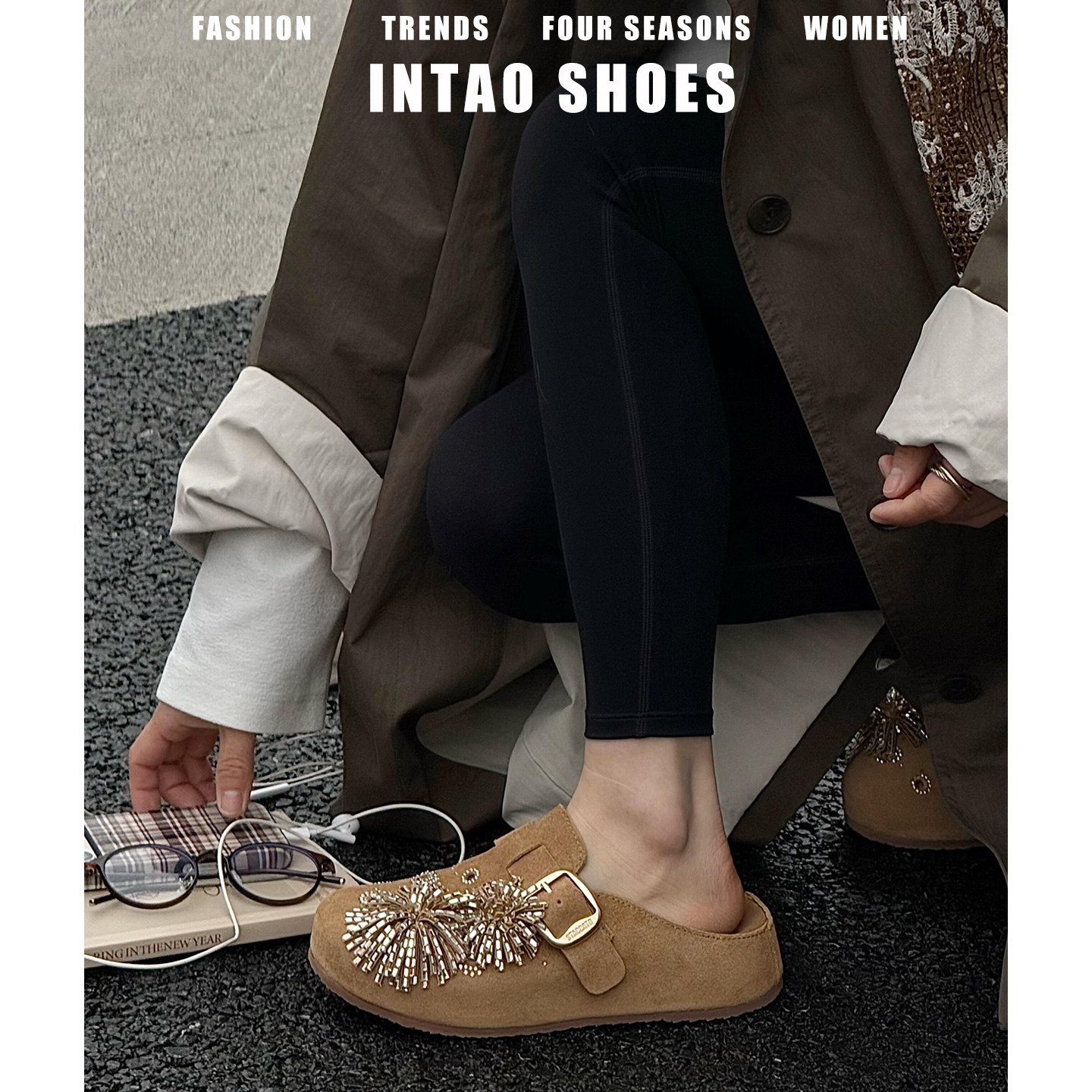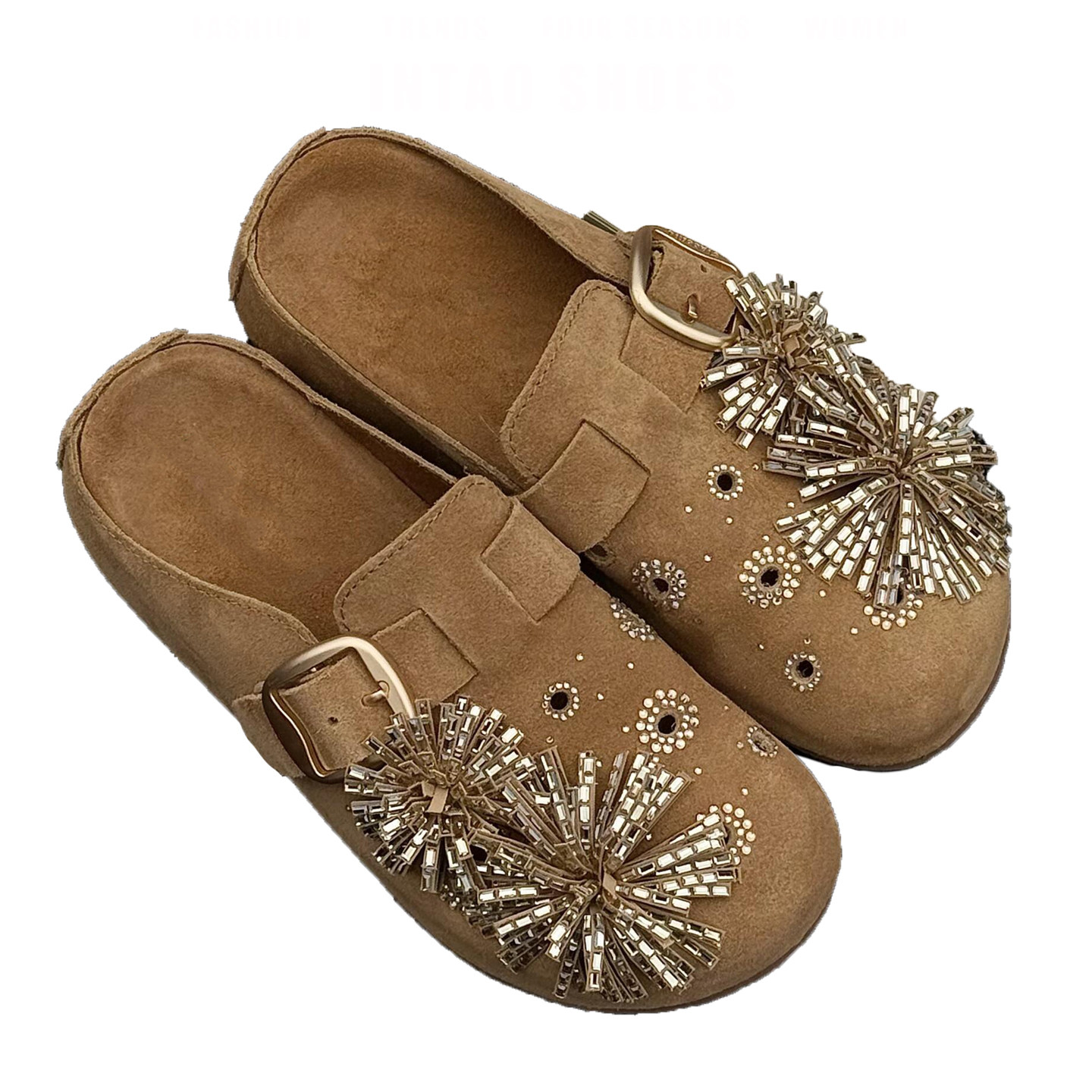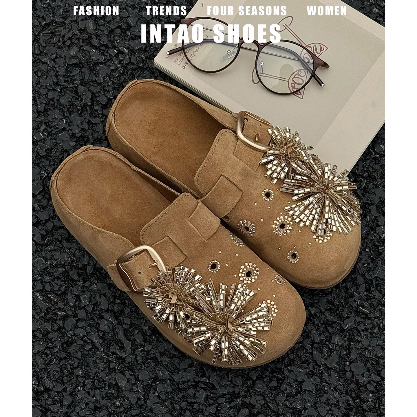 设计感小众烟花水钻厚底勃肯鞋半拖女一脚蹬半包头增高复古博肯鞋