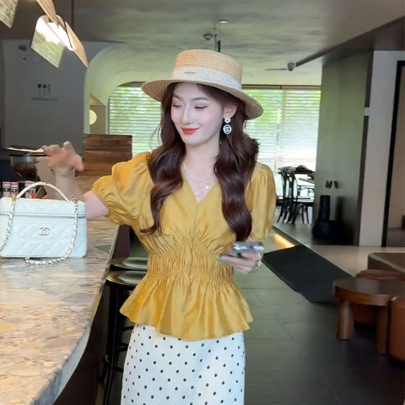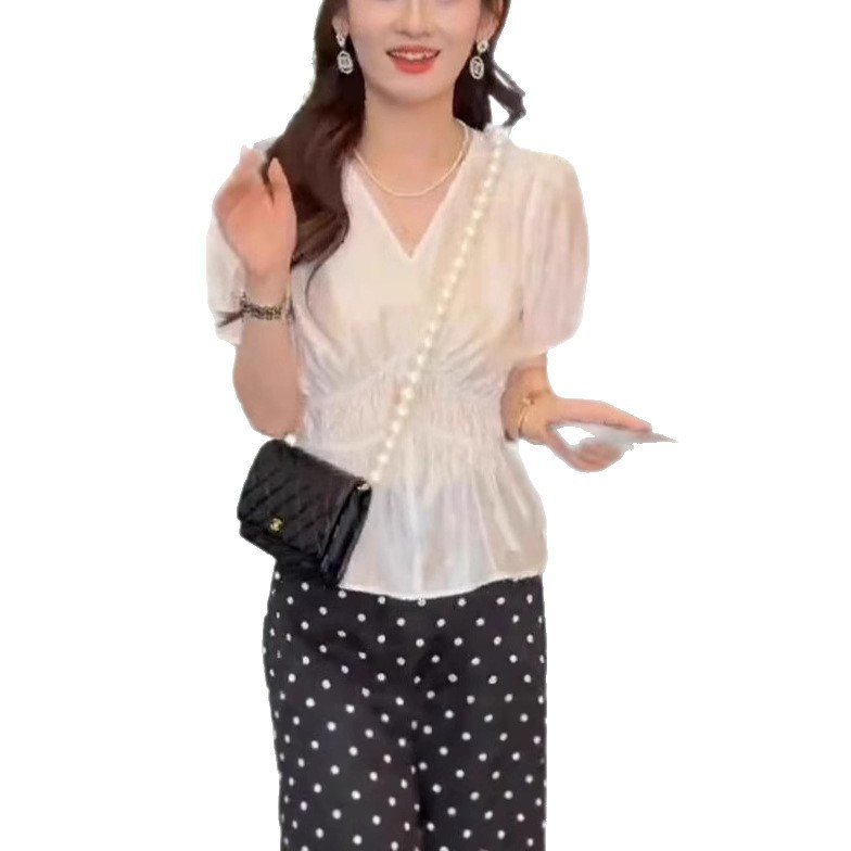 法式轻熟纯色捏褶设计收腰衬衫女2025夏季新款气质减龄短袖上衣