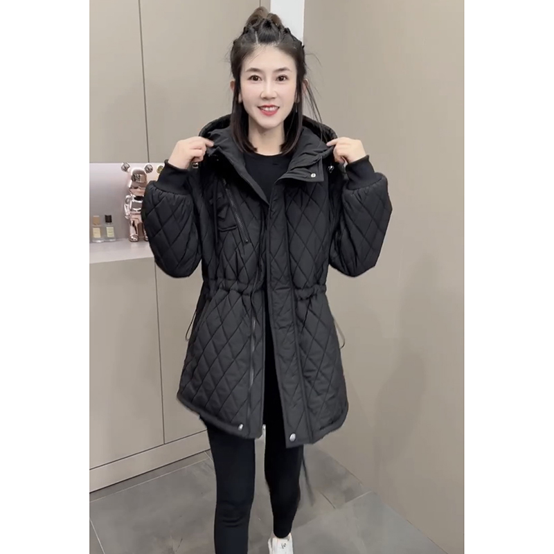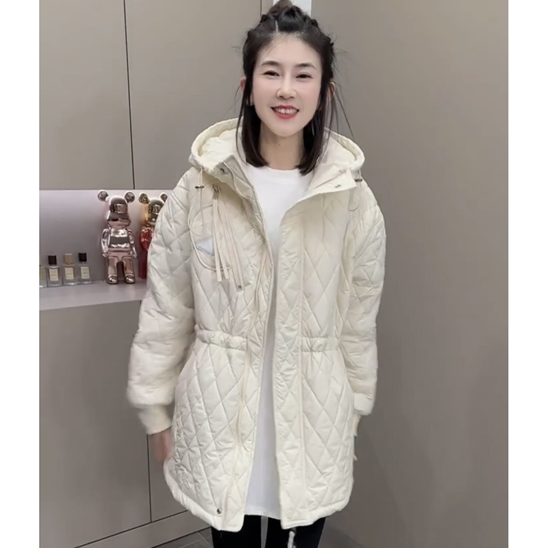 2025冬季款羽绒棉服女压花压格中长款棉袄抽绳收腰显瘦连帽薄棉衣