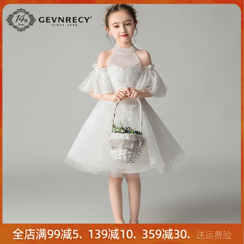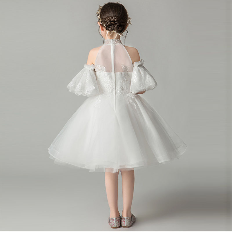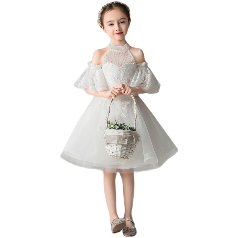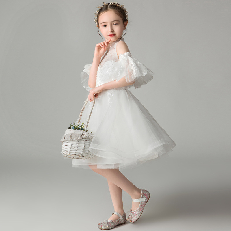 女童挂脖礼服高端白m色蓬蓬裙儿童主持人钢琴演出服女孩生日公主
