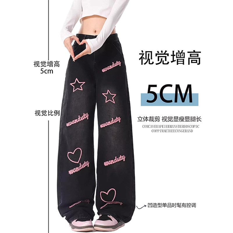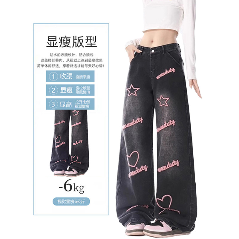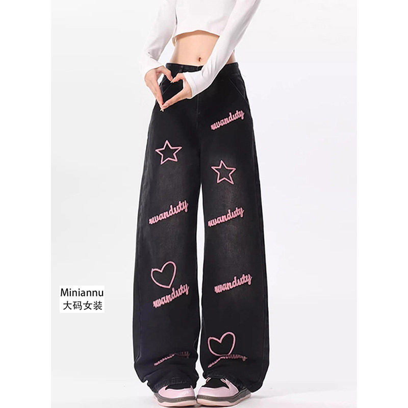 大码女装胖mm高街字母星星刺绣直筒牛仔裤女春季新款宽松阔腿裤子