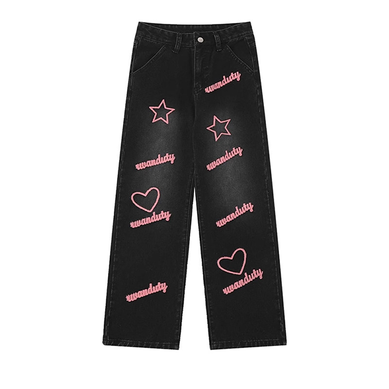特大码美式复古ins爱心刺绣长裤