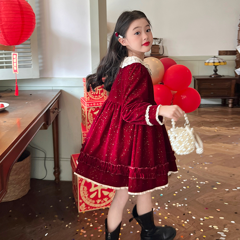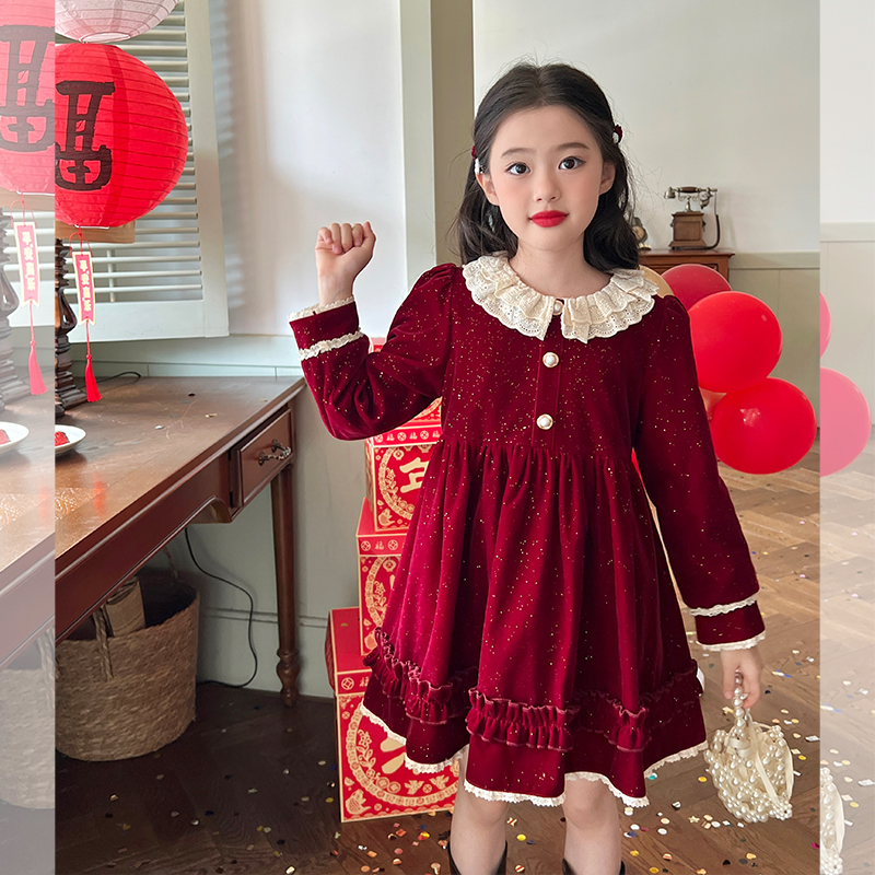 栀了成长记童装女童红色水钻丝绒公主裙冬儿童宝宝裙子加绒连衣裙