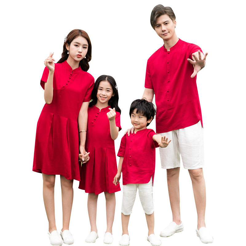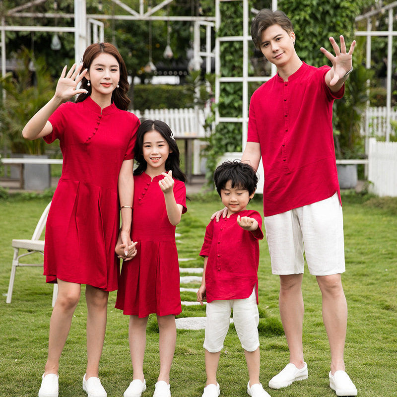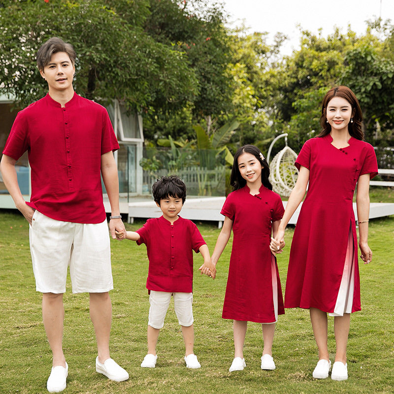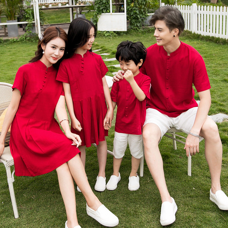 中国风连衣裙一家三口全家装棉麻