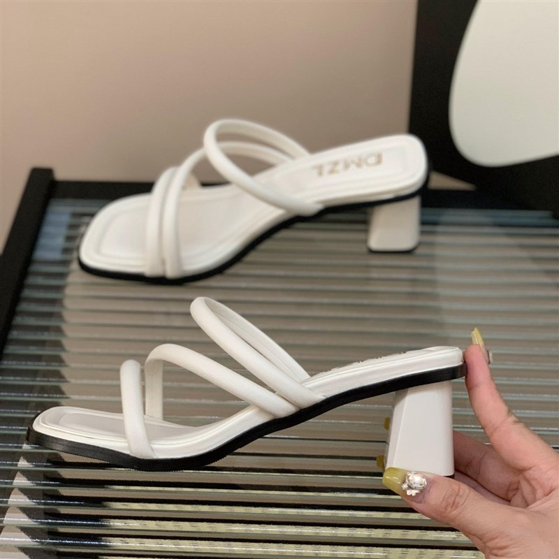 法式粗跟方头凉拖鞋女2025夏季新款仙女风简约细带度假高跟一字拖