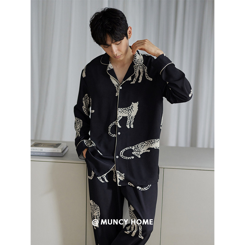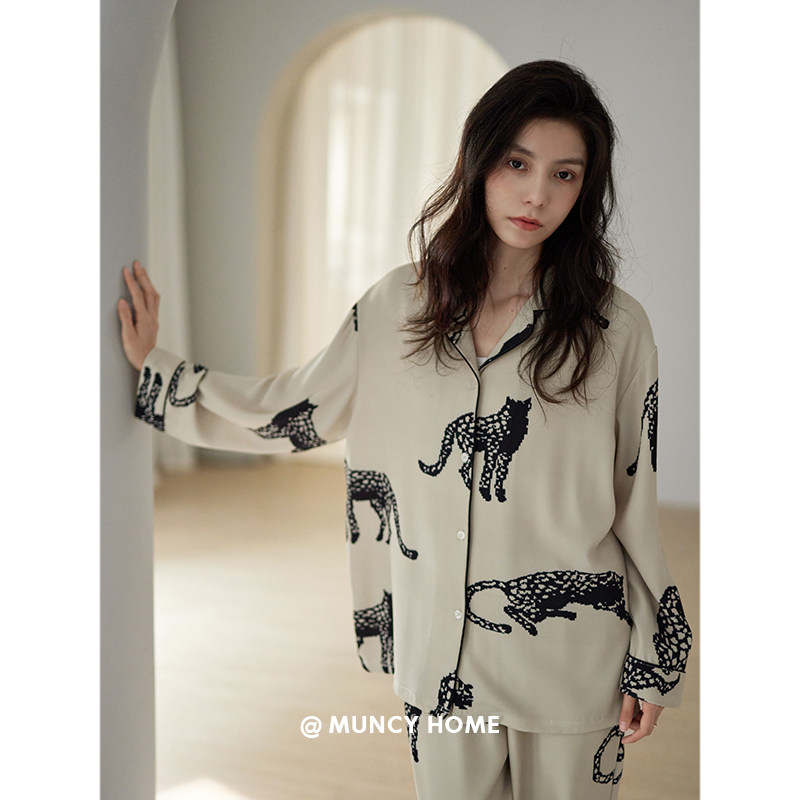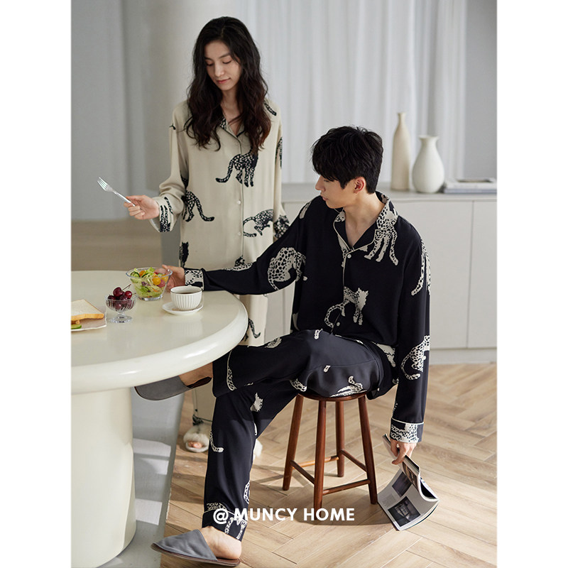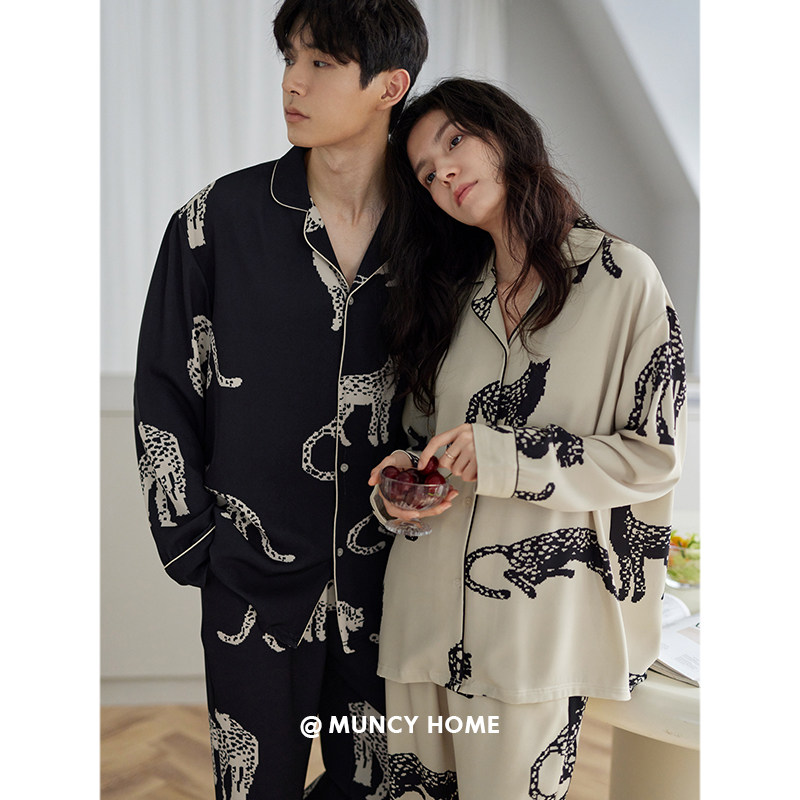 曼系【口碑推荐】春秋睡衣情侣款简约家居服韩版豹子长袖男女套装