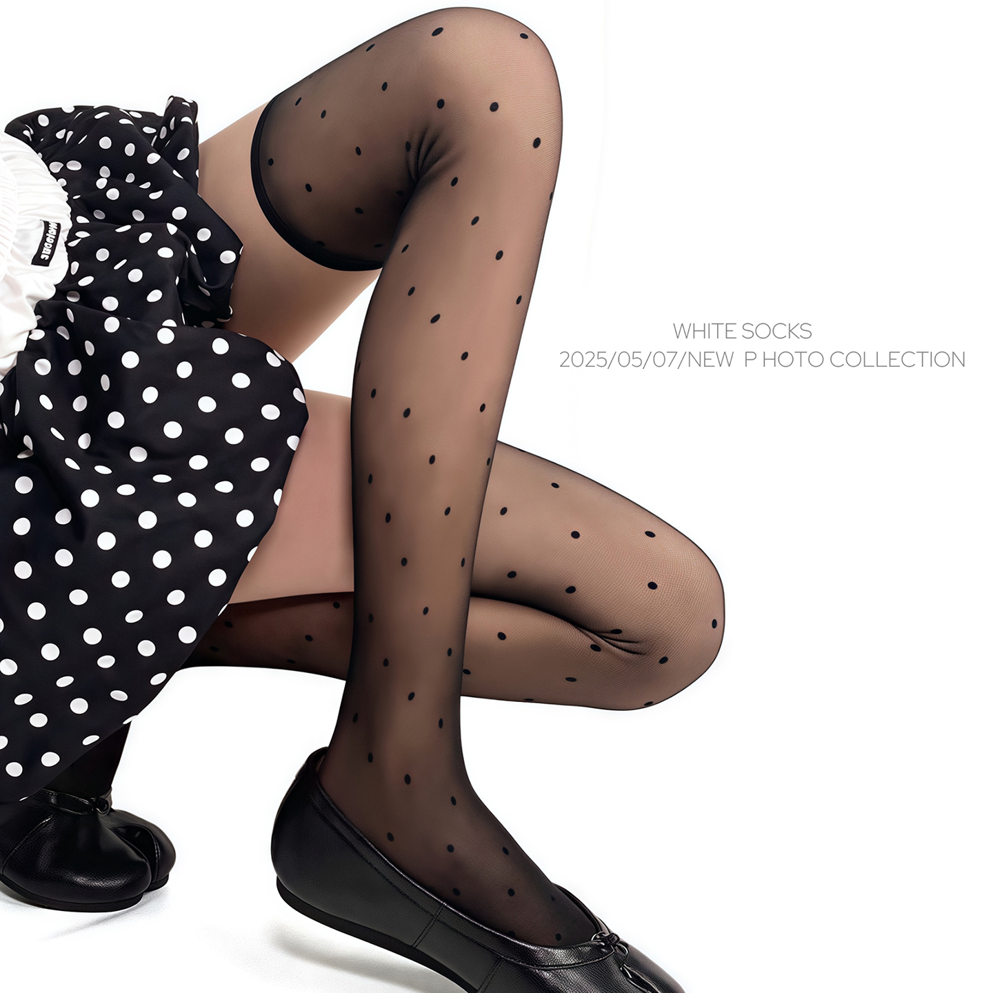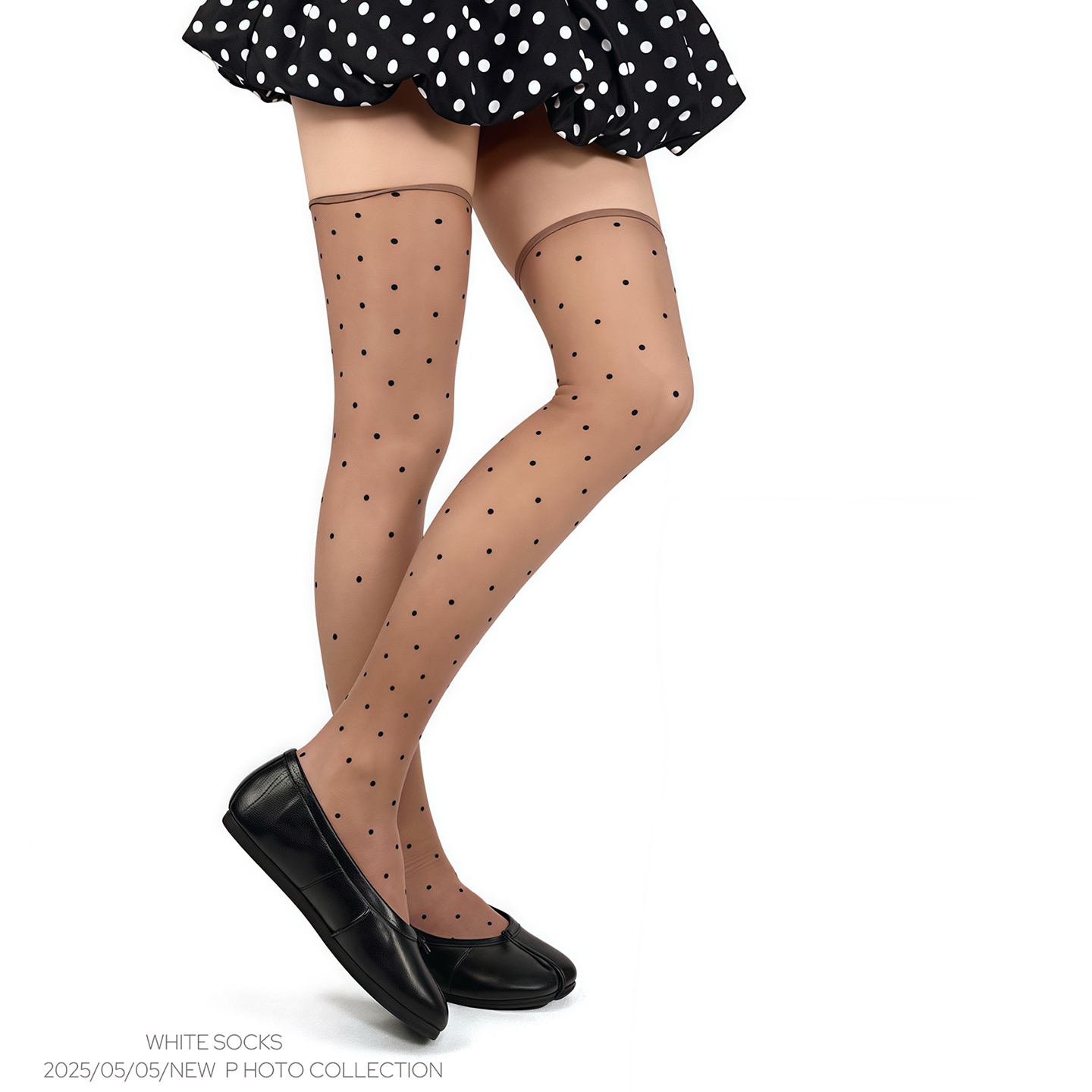 WHITE SOCKS 春夏棕色半桶波点丝袜高弹日系防勾丝高筒薄款大腿袜