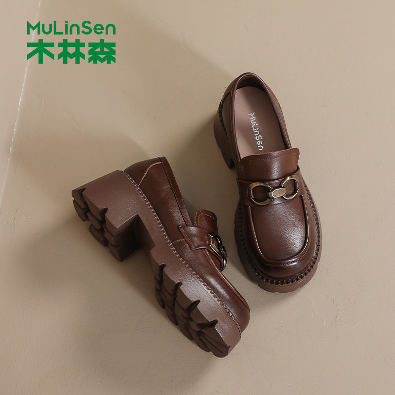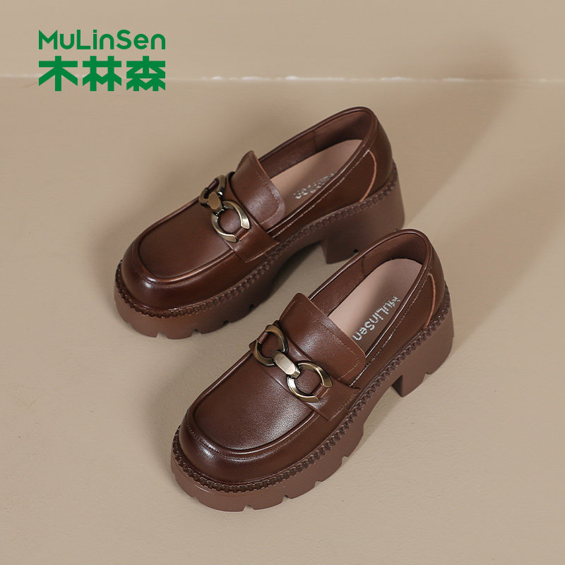 木林森乐福鞋女秋季新款英伦风小皮鞋女头层牛皮粗跟高跟浅口单鞋