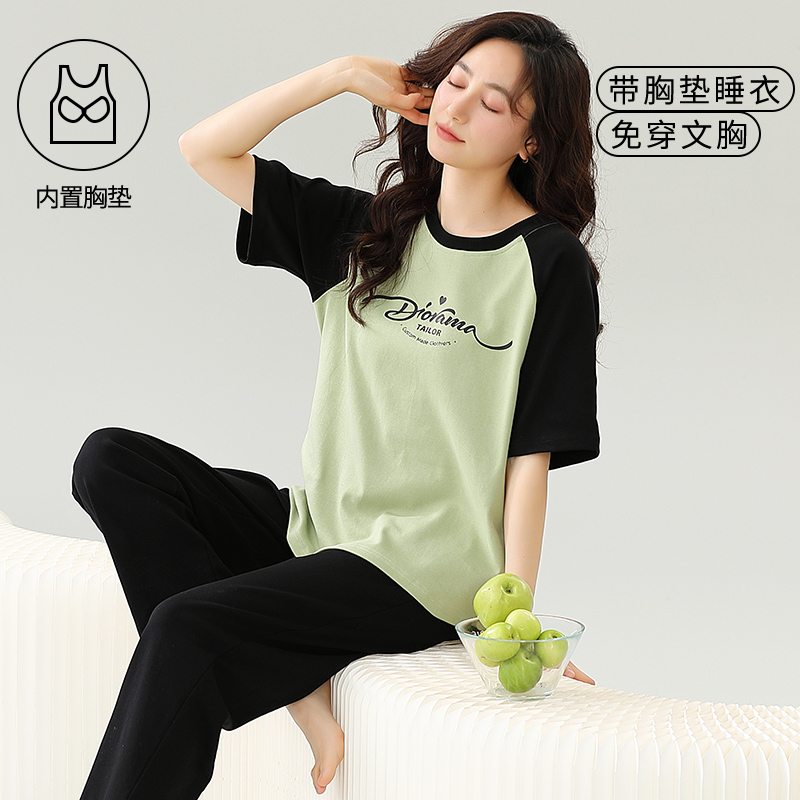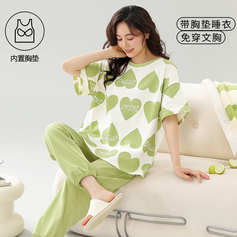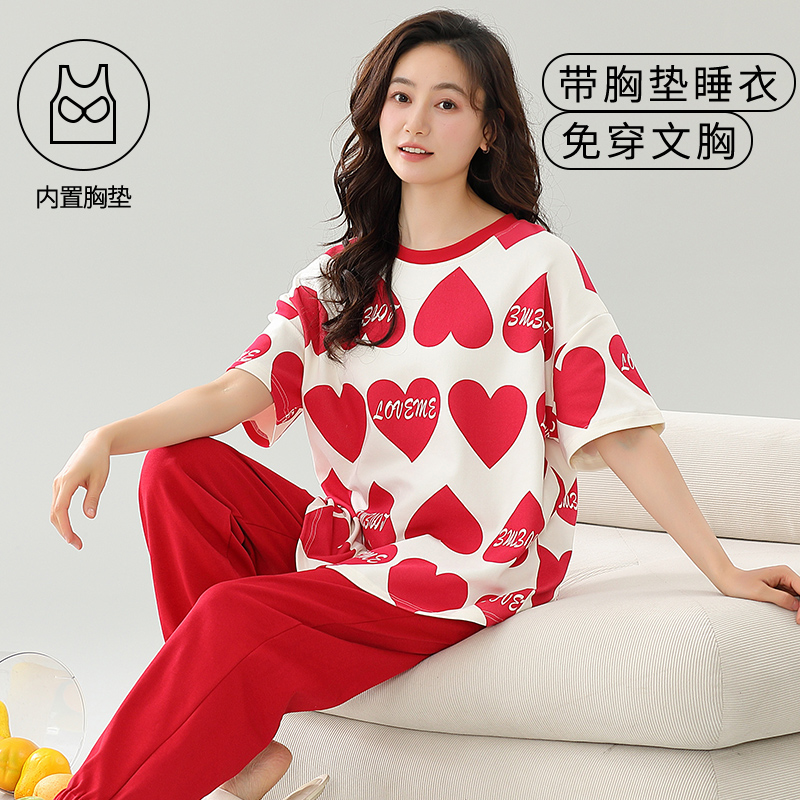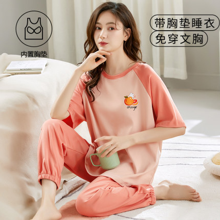 睡衣女款2024春夏季自带胸垫一体短袖长裤被窝少女外穿家居服套装