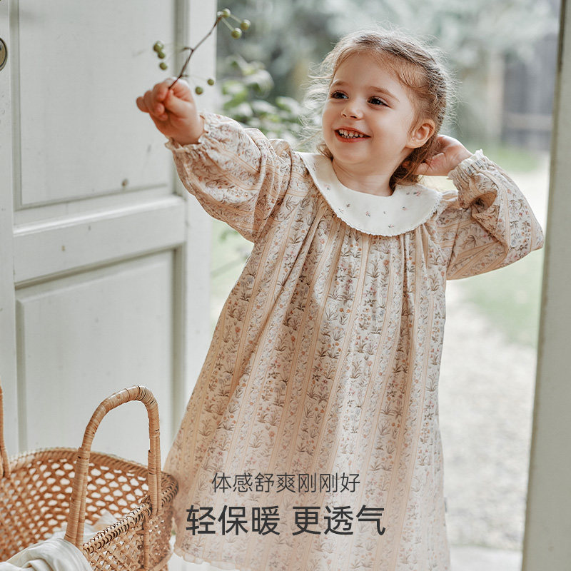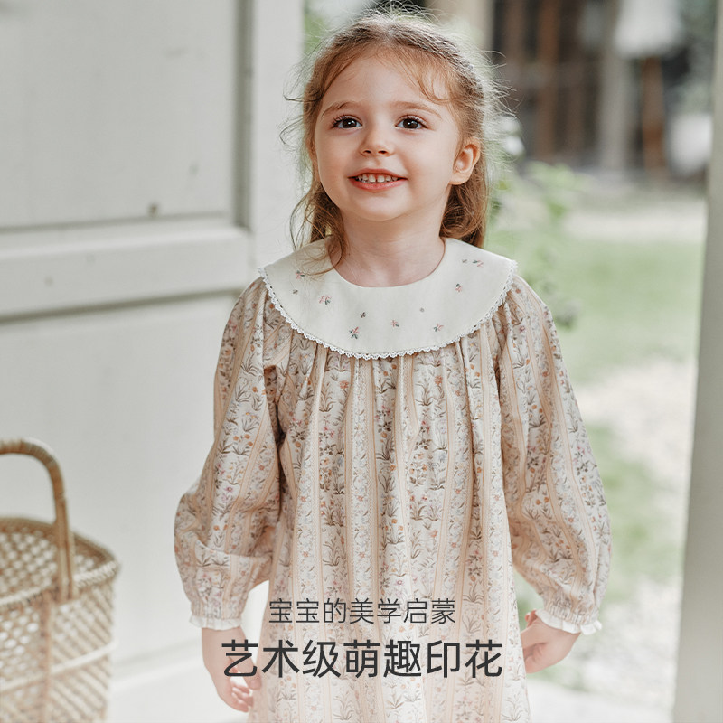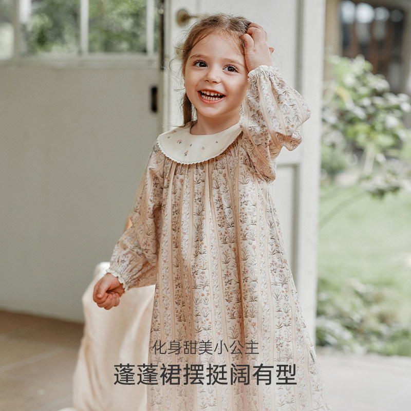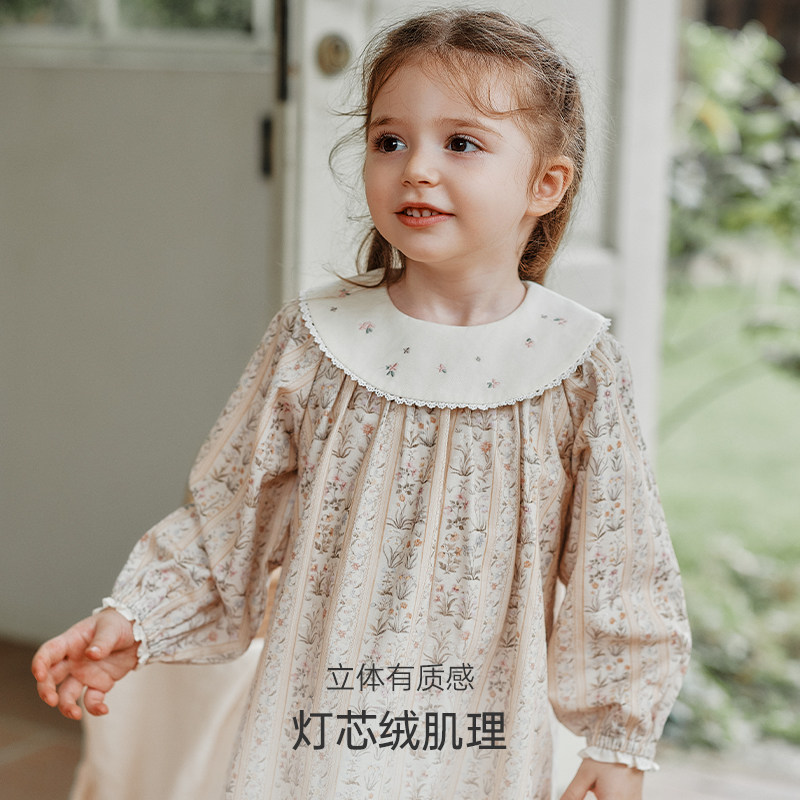 Oak Family秋季儿童长袖灯芯绒连衣裙女宝宝荷叶边蕾丝拼接裙