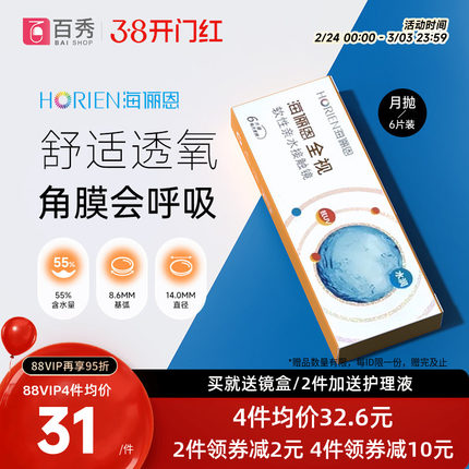 海俪恩隐形近视眼镜全视月抛6片装/盒官方旗舰店正品水凝胶透明片