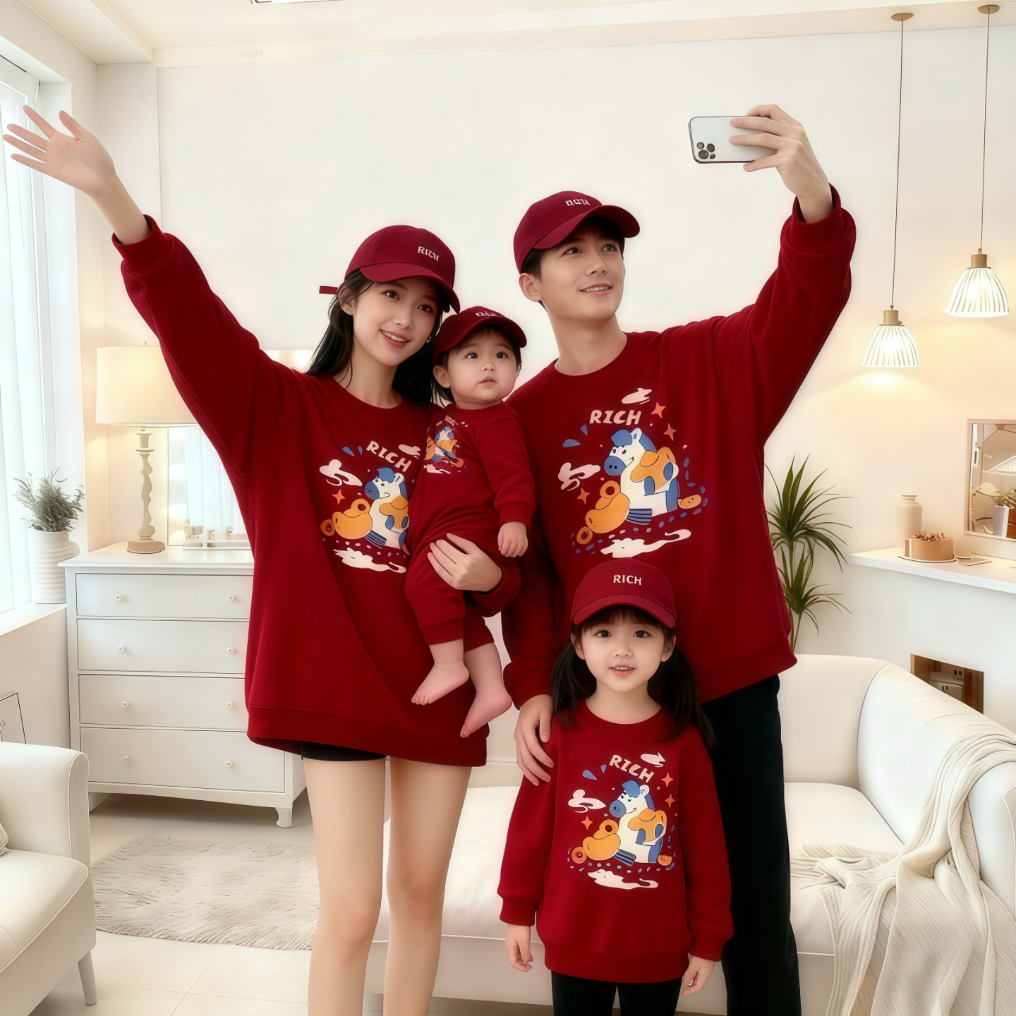 马年亲子装秋冬新款一家三口四口母子母女2026新年红色全家福卫衣