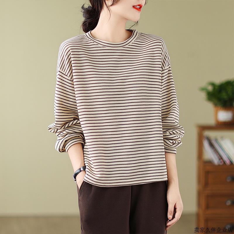 时尚条纹纯棉长袖T恤卫衣女春秋宽松百搭圆领套头衫打底妈妈上衣