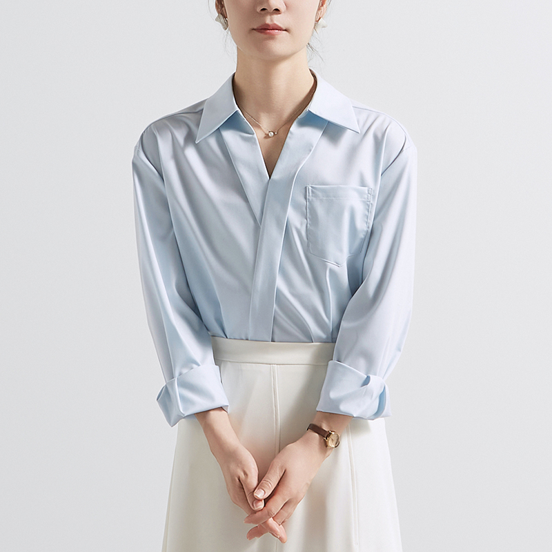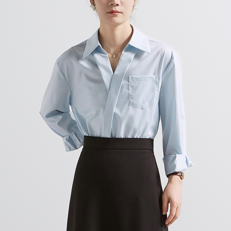 CHICBLISS浅蓝色衬衫女春秋长袖别致V领通勤气质法式小资上衣女士