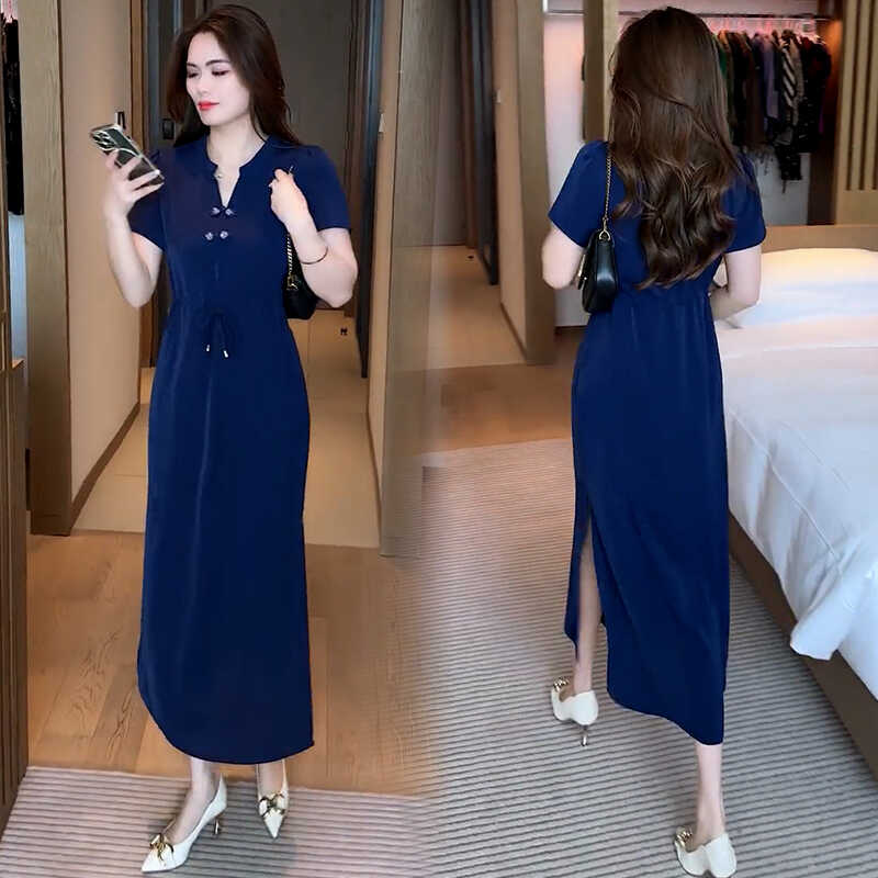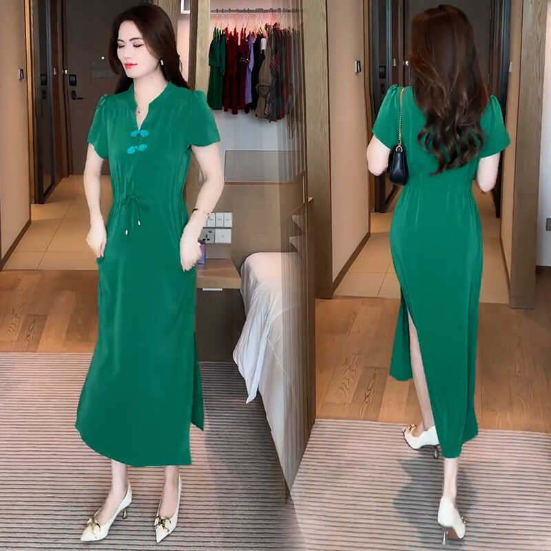 新中式盘扣连衣裙女2025夏季新款洋气显瘦减龄收腰开叉中长款裙子