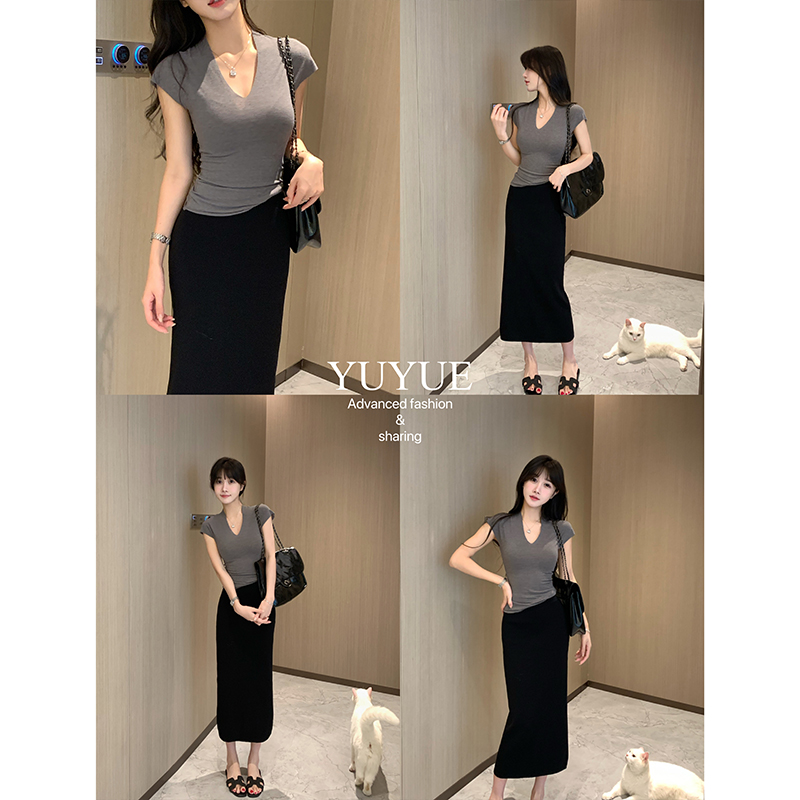 愉悦愉悦V领紧身收腰纯欲短袖T恤女夏季韩系修身简约气质黄色上衣
