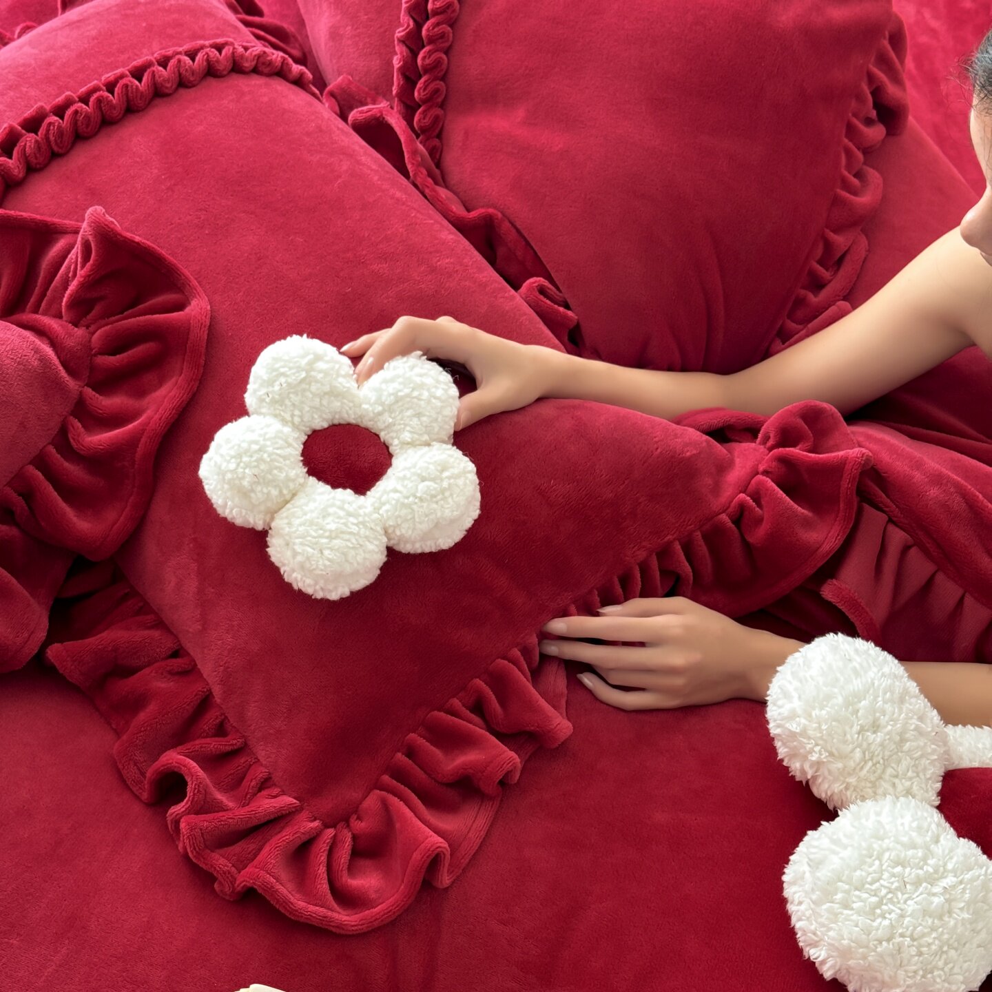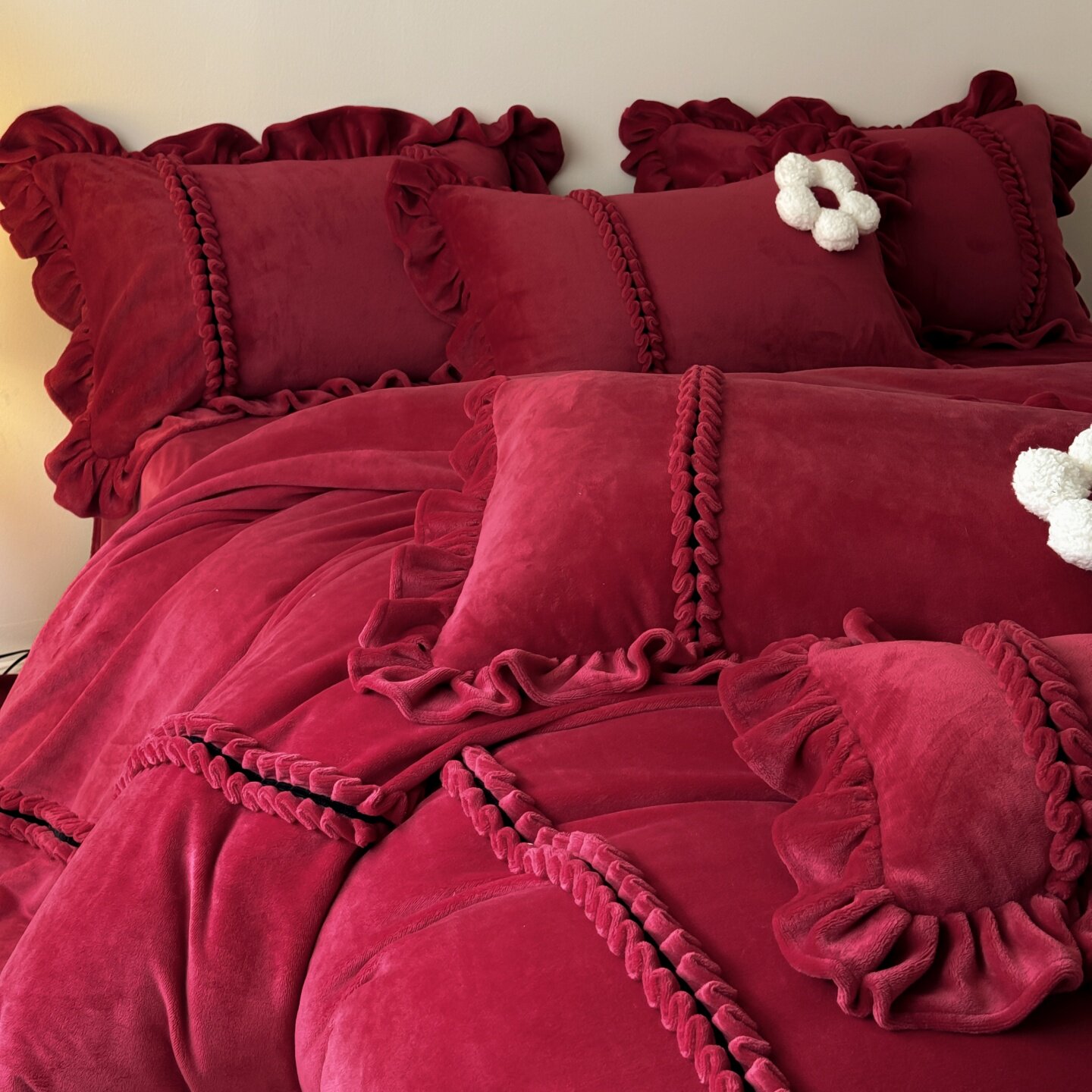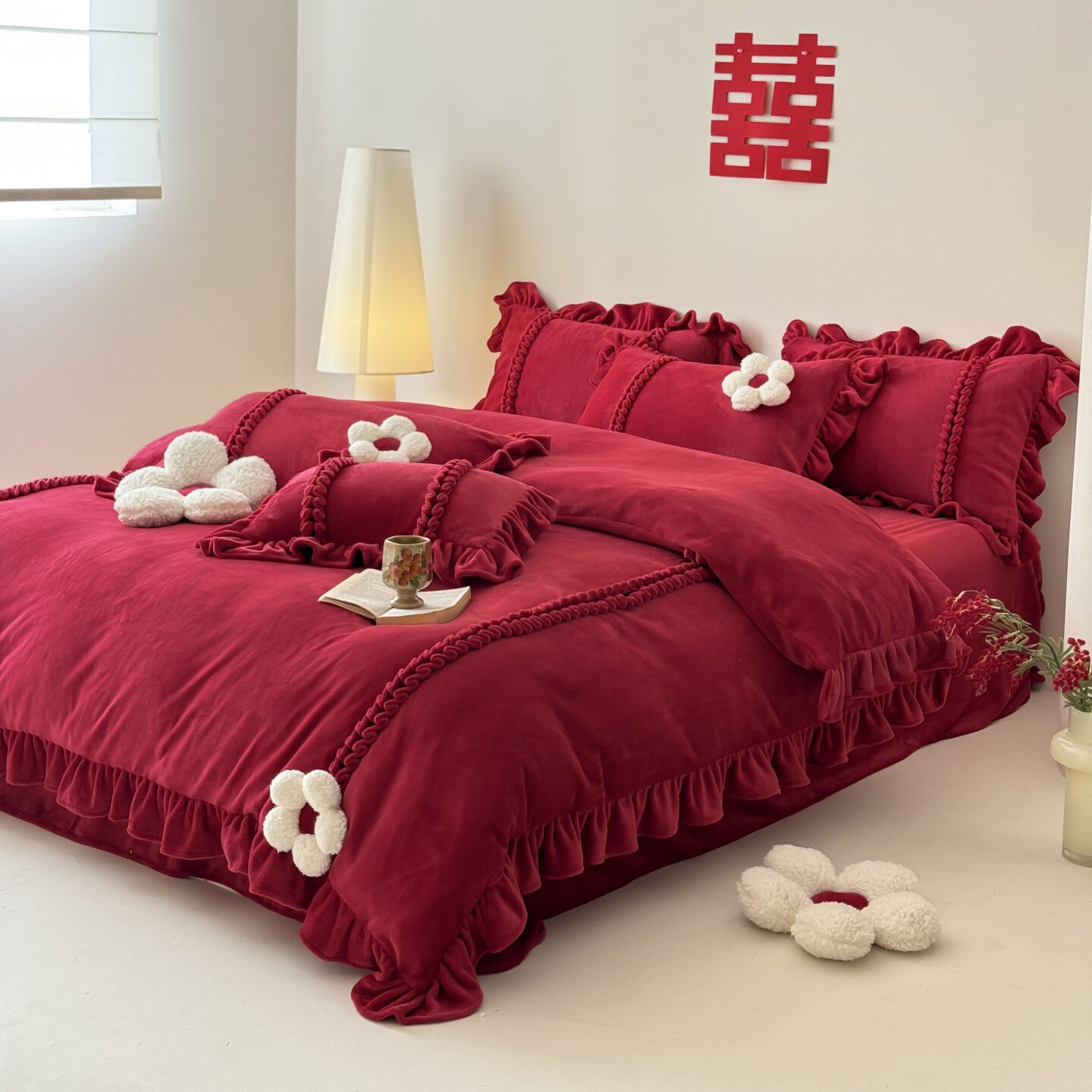 ROLAND LIVE冬季加厚牛奶绒婚庆四件套花边被套床单红色喜庆套件