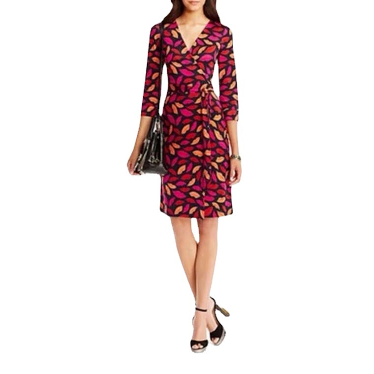D家明星同款气质优雅红唇印花连衣裙女秋新款收腰绑带长裙裹身裙