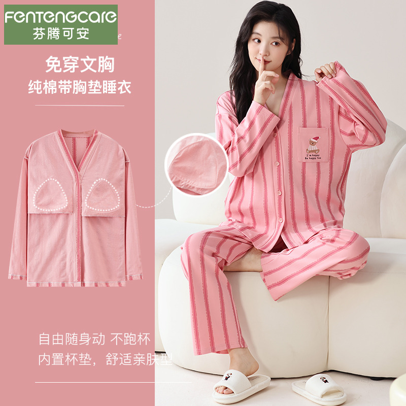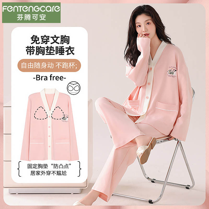 芬腾可安100%纯棉睡衣女2025新款带胸垫春秋季长袖开衫和服家居服