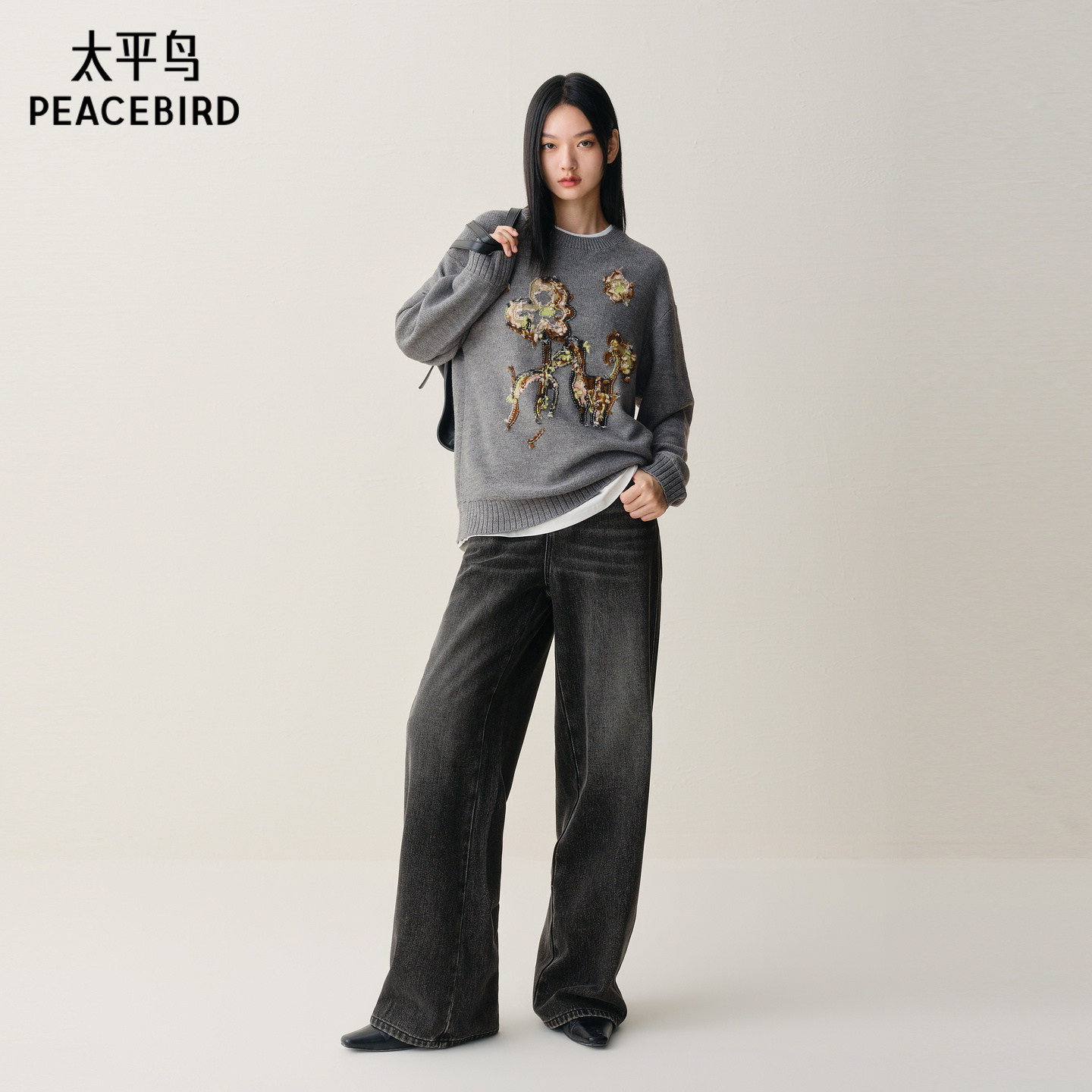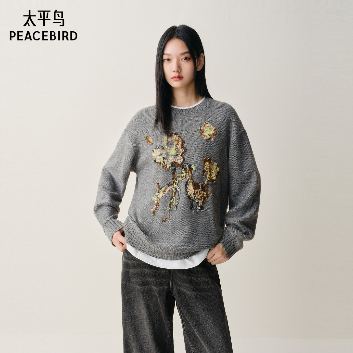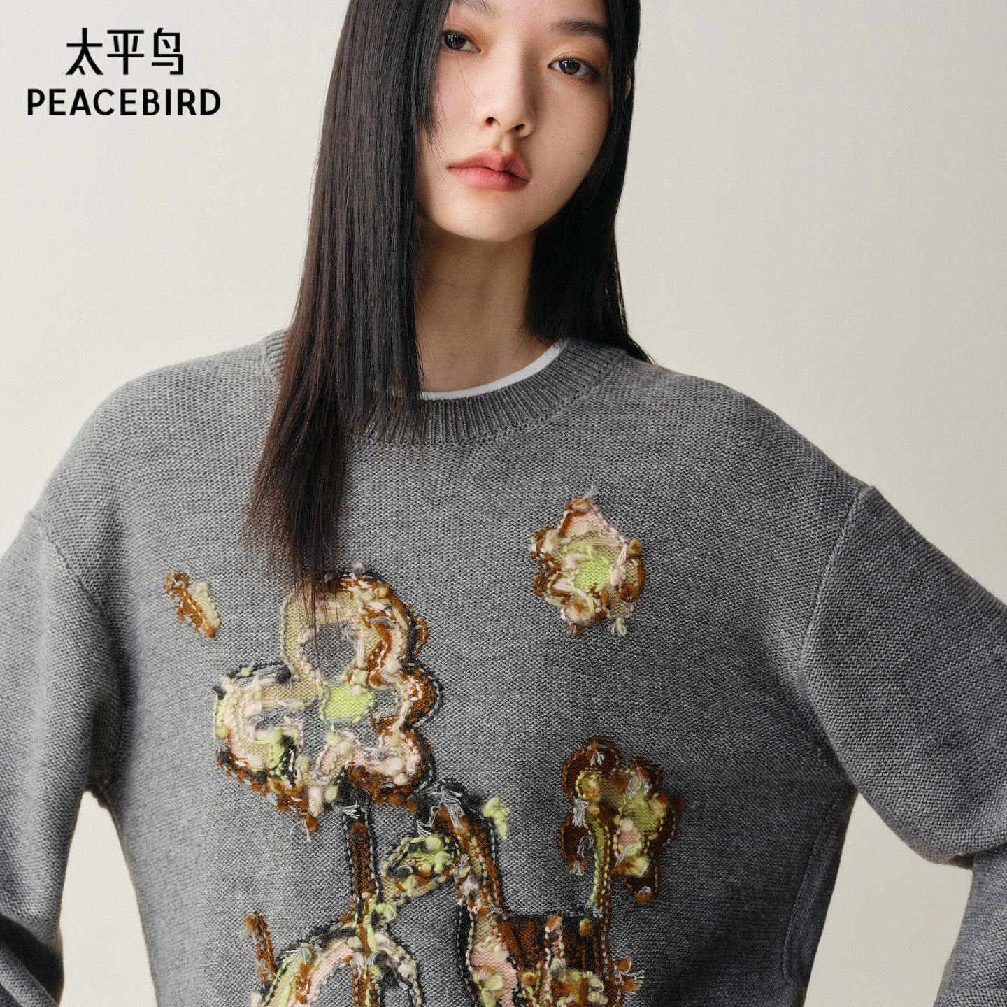 太平鸟 羊毛混纺重工立体花朵图案时髦圆领针织衫25冬新款套头衫