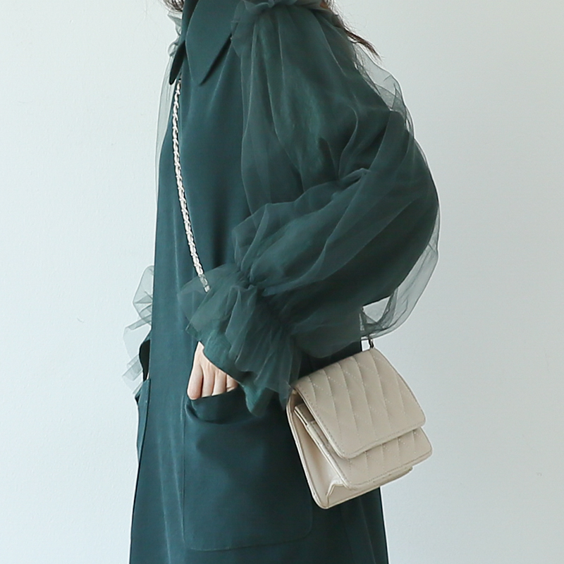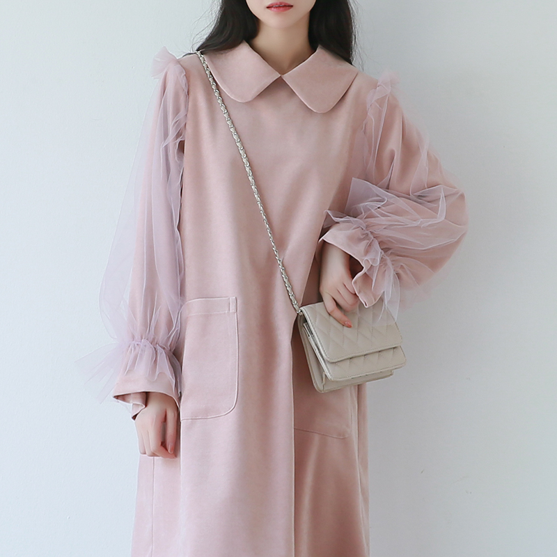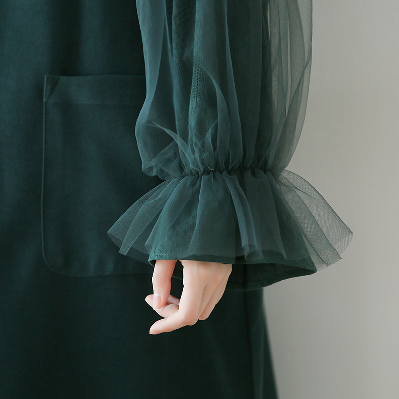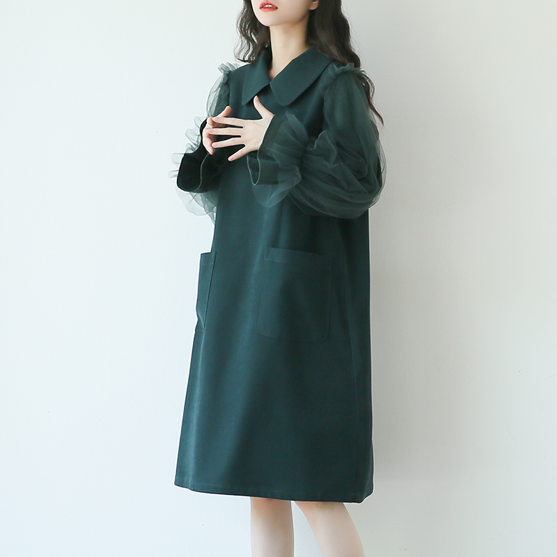 suin2025春秋新款甜美宽松大码拼纱绿色娃娃领喇叭长袖连衣裙女
