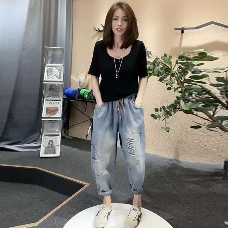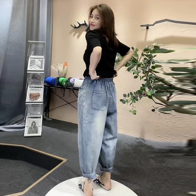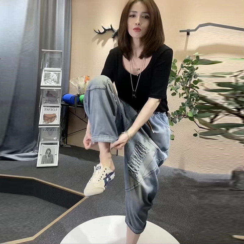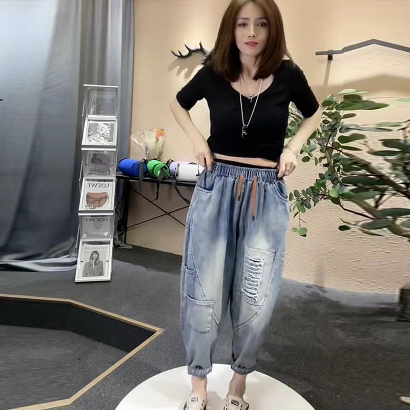 2026年宽松春秋款牛仔跨裤女松紧腰破洞哈伦裤高腰复古萝卜裤九分