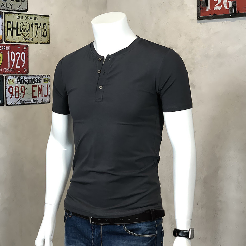 短袖/男装亨利领开门筒襟薄款硬汉白色纯棉黑色弹力修身衫T恤上衣