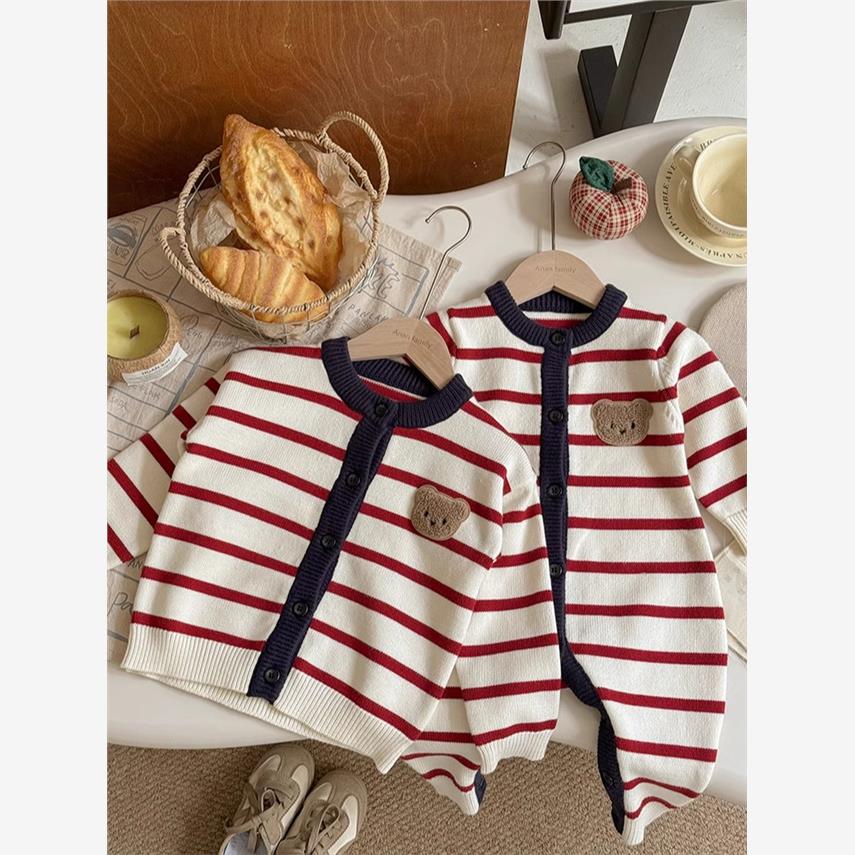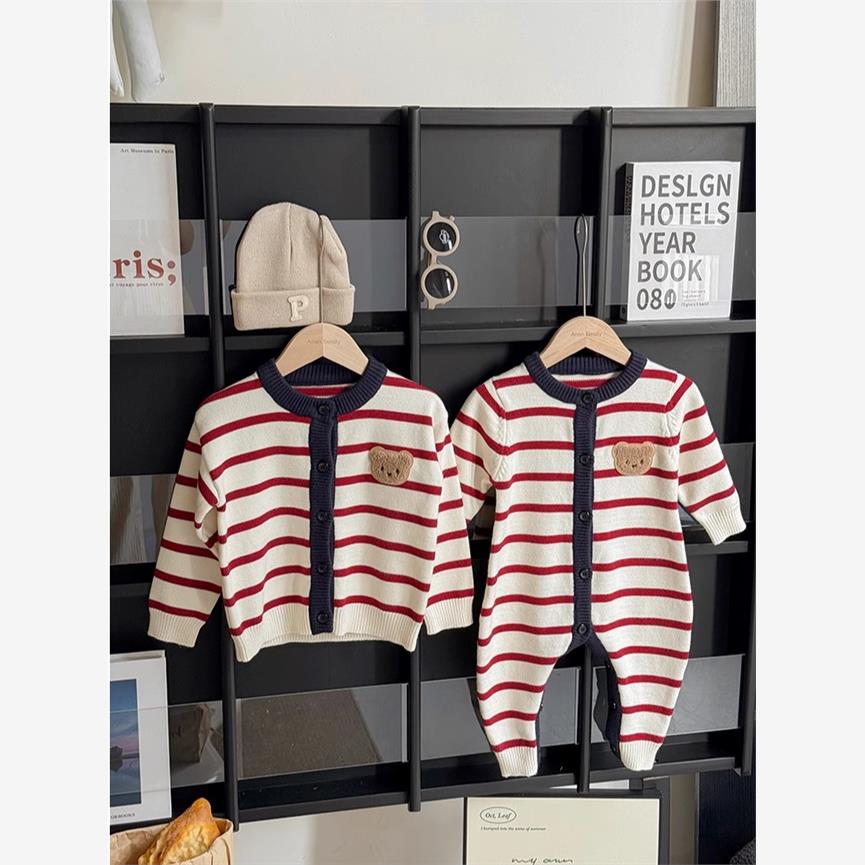 小月龄亲子装一家三口条纹毛衣2025新款婴儿爬服秋冬母女开衫外套