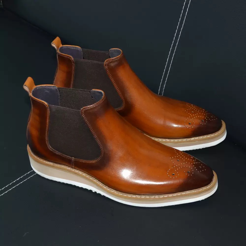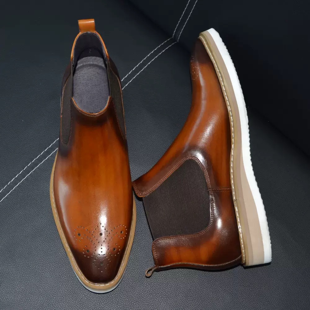 头层牛皮雕花布洛克英伦复古切尔西发泡厚底版短靴套筒一脚蹬男靴