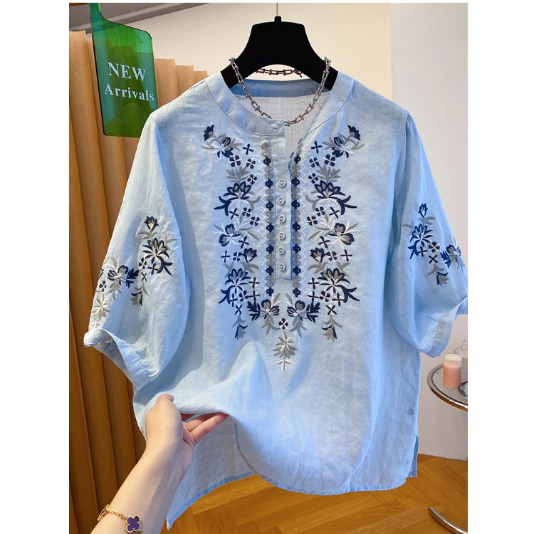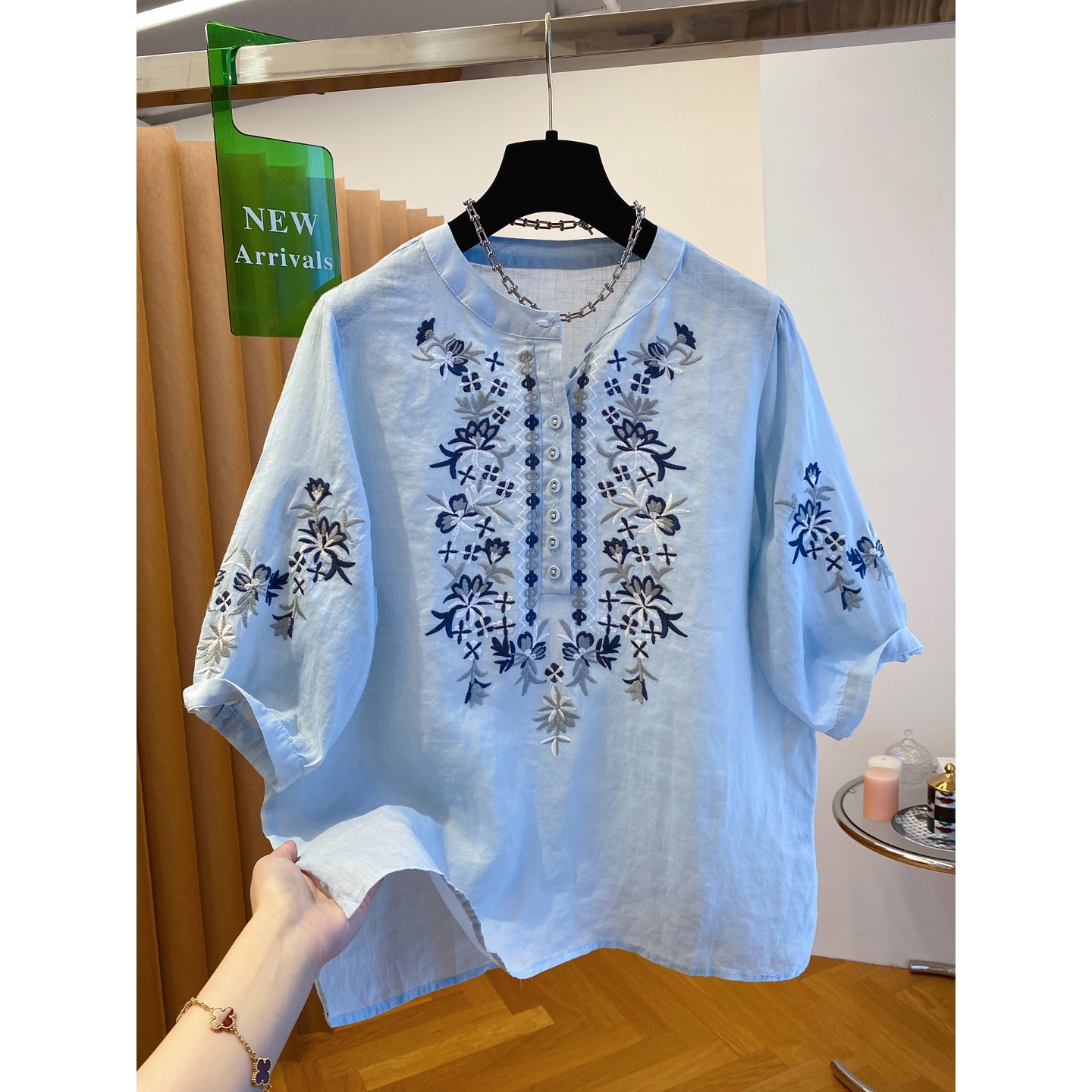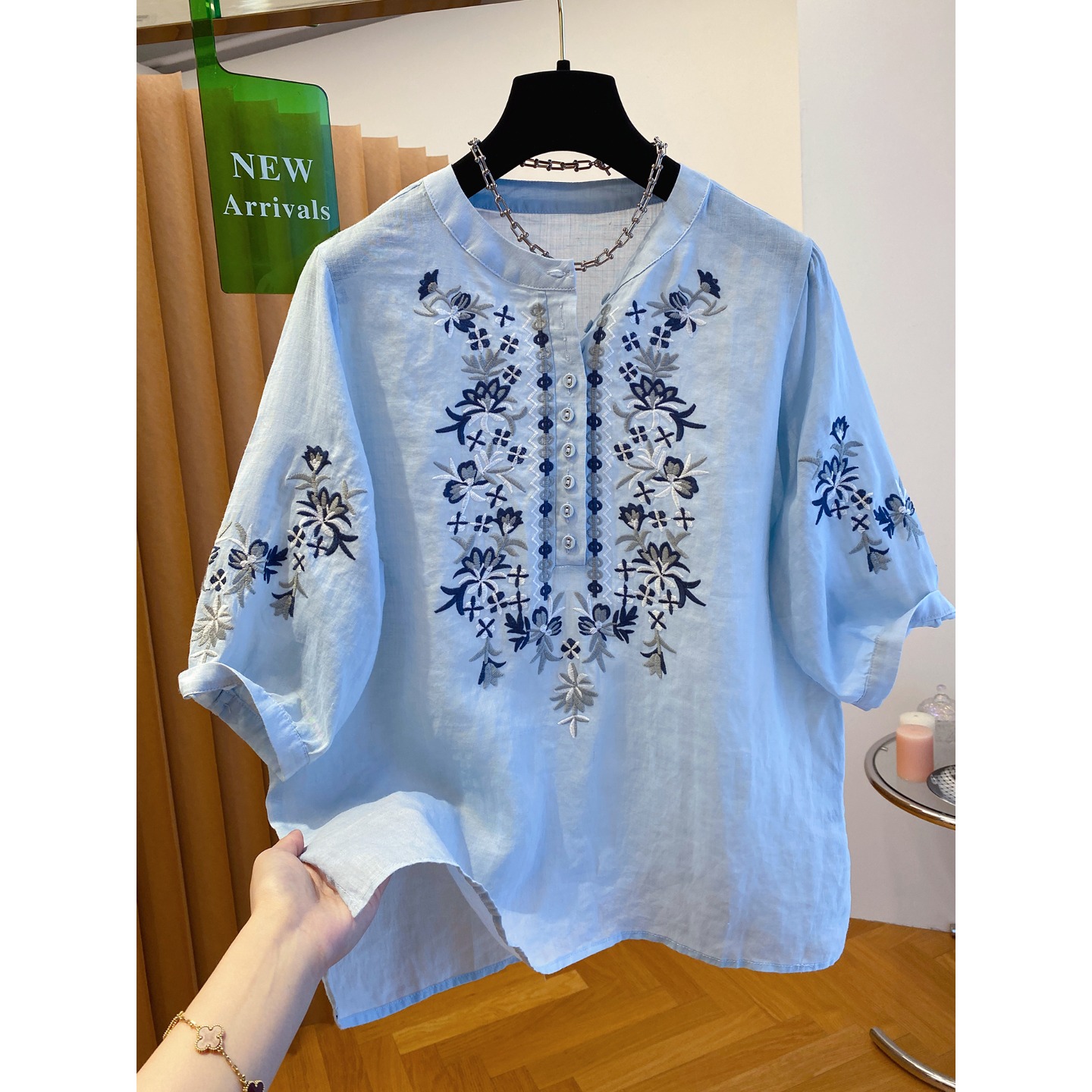 复古民族风棉麻刺绣中袖衬衫女士夏季宽松遮肚子独特漂亮亚麻上衣