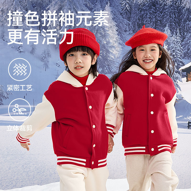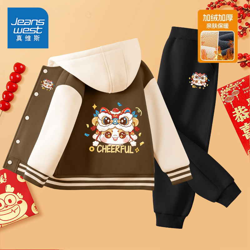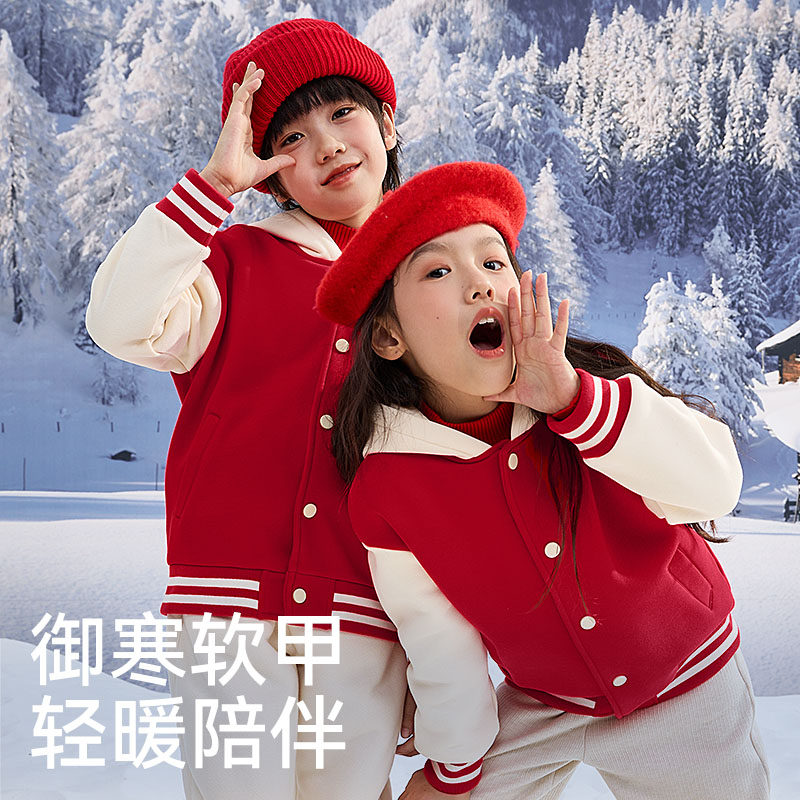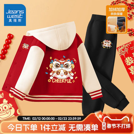 真维斯童装男童外套儿童加绒拜年服棒球服套装男孩红色过年衣服冬