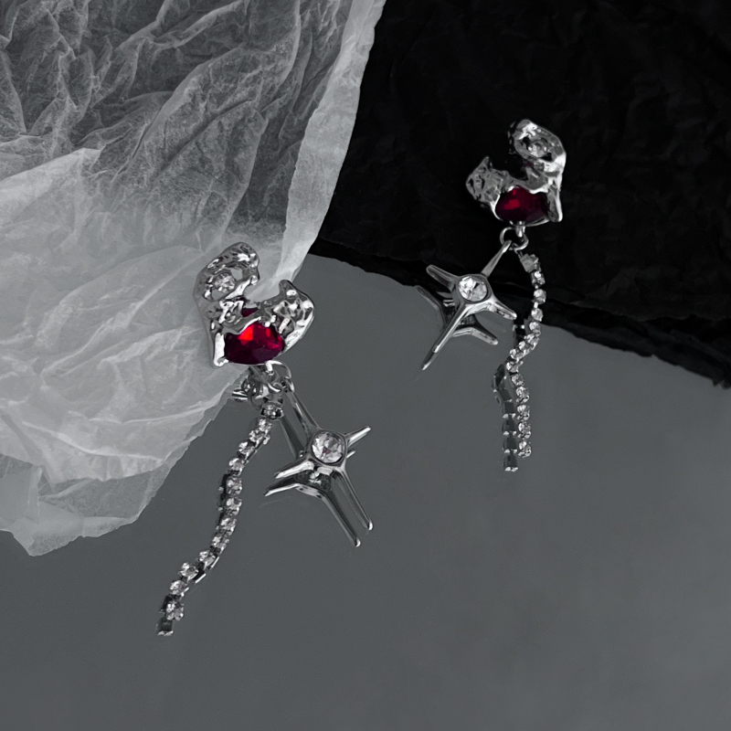 KANSAI新款红宝石爱心流苏四芒星耳针女冷淡风耳环设计感小众耳钉