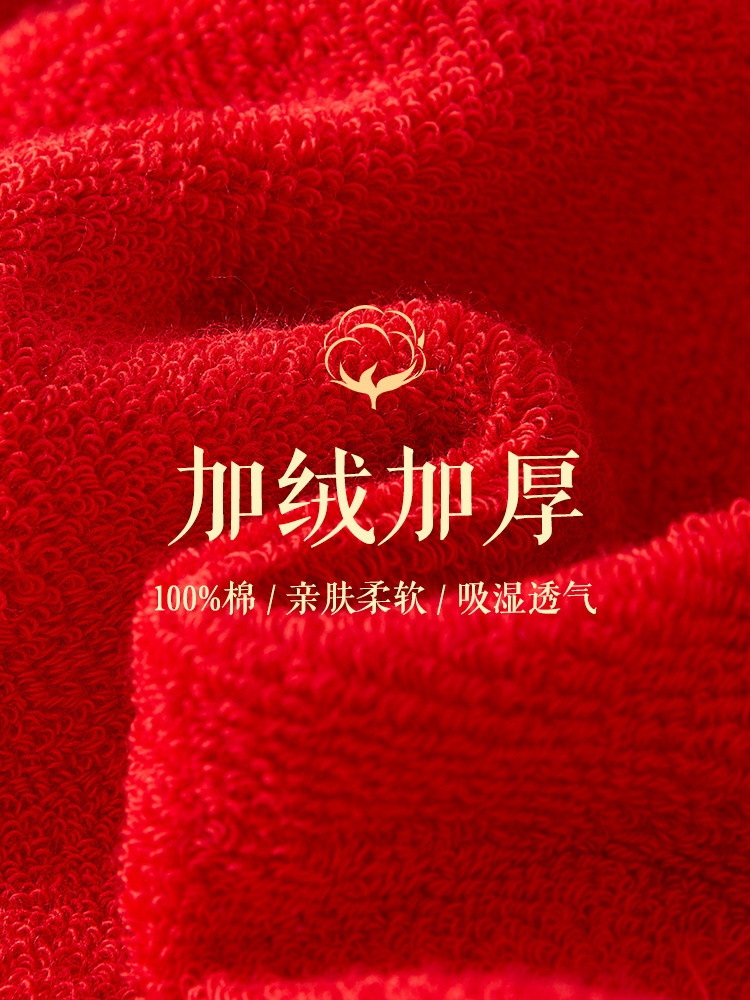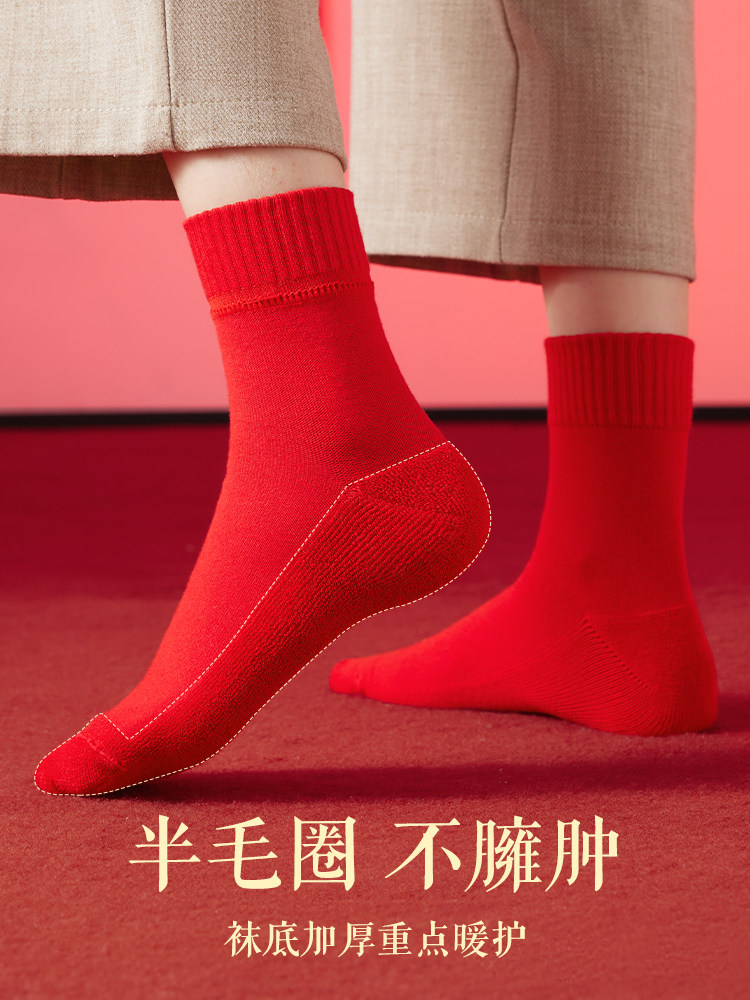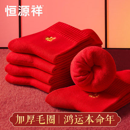 恒源祥本命年袜子男纯棉加厚毛圈保暖中筒女结婚福字大红色属蛇年