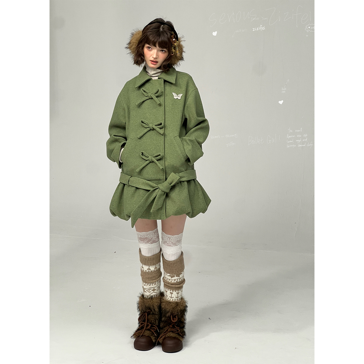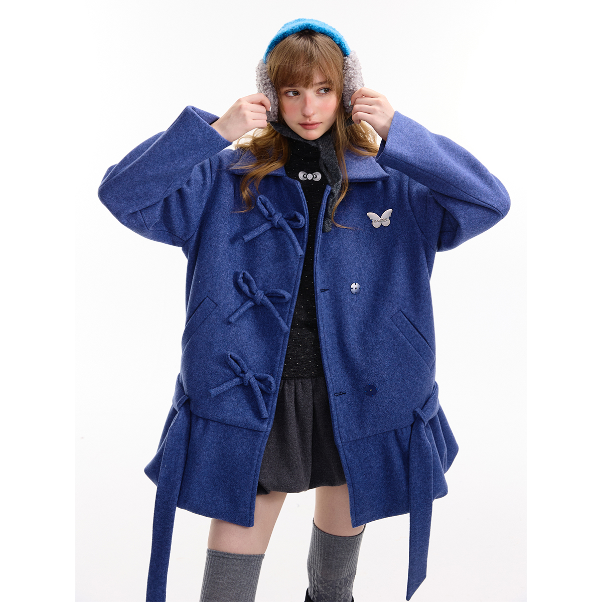 ziziFei秋冬美式复古设计感蝴蝶结兜兜下摆中长款毛呢大衣外套女