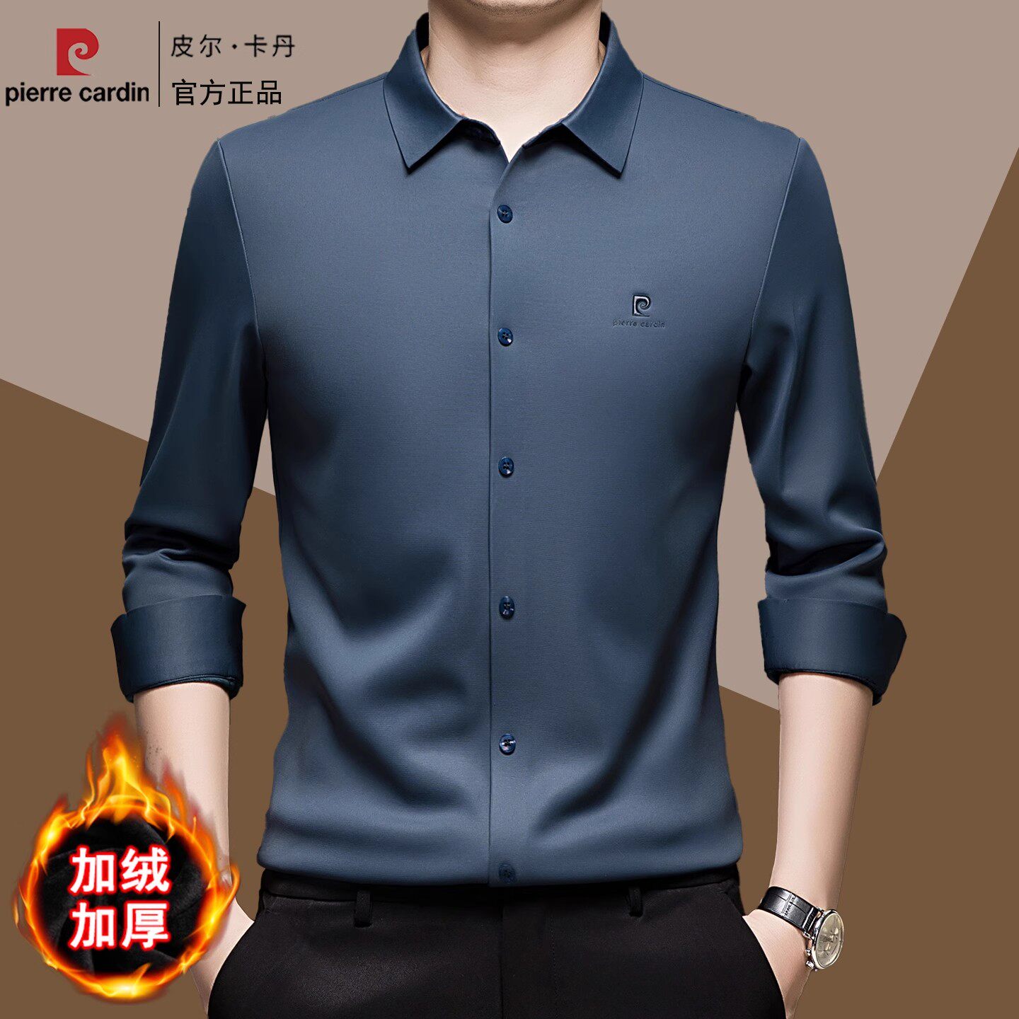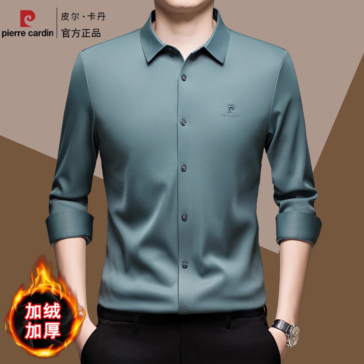 皮尔卡丹桑蚕丝加绒加厚长袖衬衫男士冬季新款商务爸爸装休闲衬衣